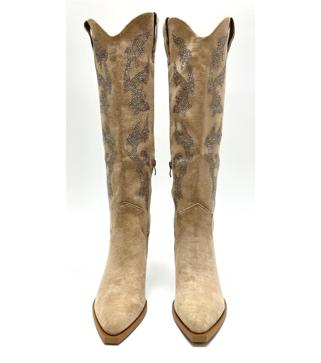 Bota de mujer de antelina con brillo. Media cremallera. Tacon 8.5mc. Caña 43cm