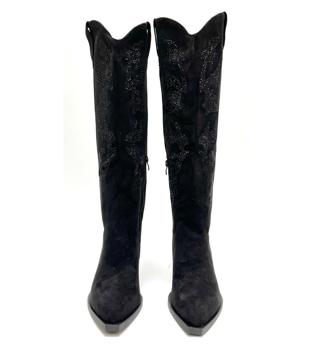 Bota de mujer de antelina con brillo. Media cremallera. Tacon 8.5mc. Caña 43cm