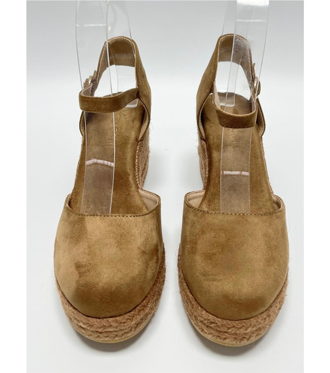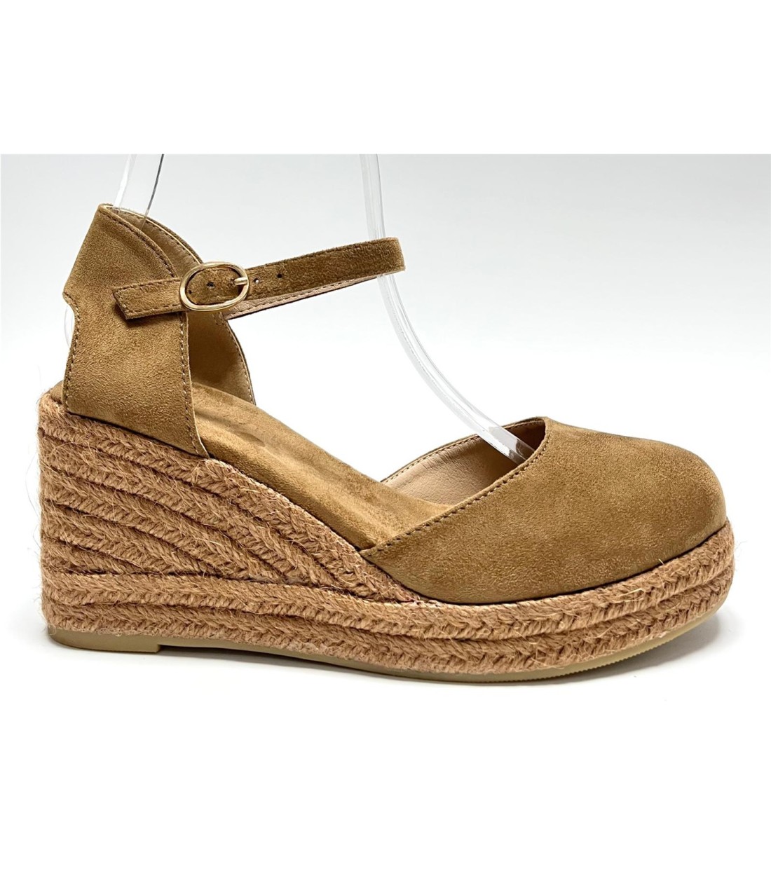 Cuña de mujer de esparto y antelina (blanco y dorado polipiel) con correa al tobillo. Cuña 8cm. Plataforma 2cm
