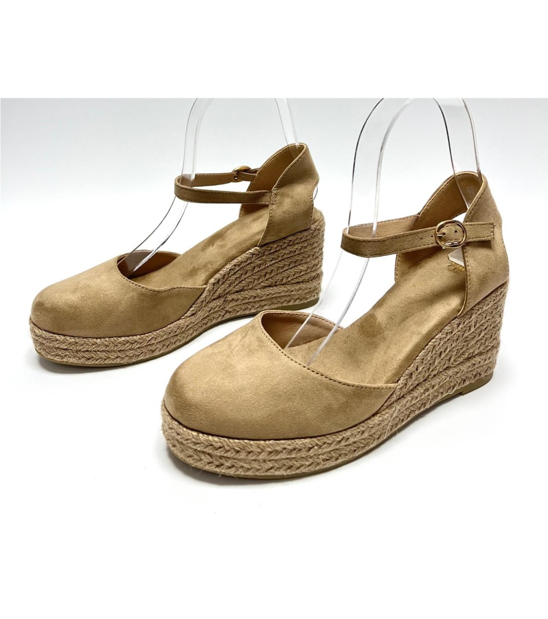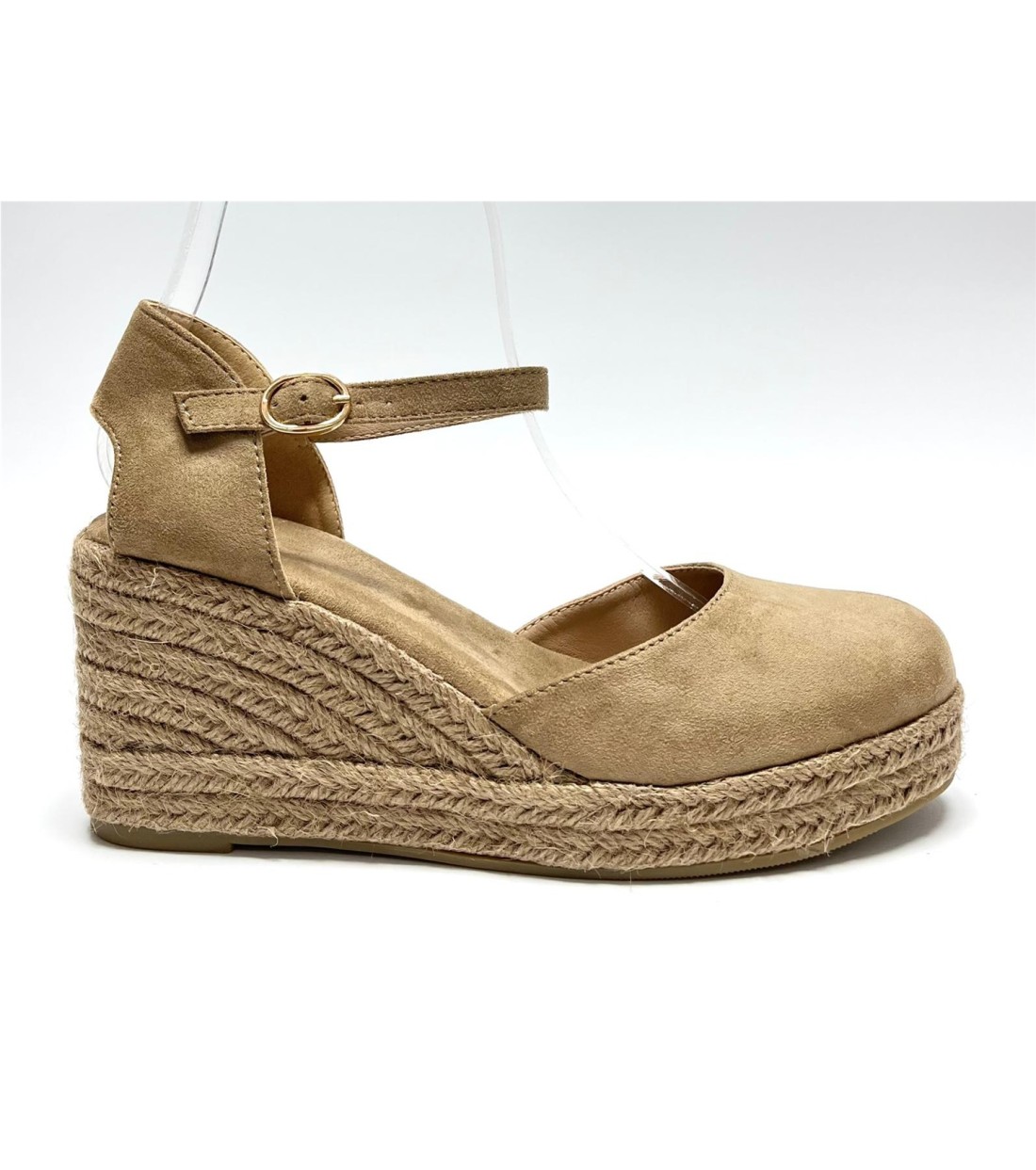Cuña de mujer de esparto y antelina (blanco y dorado polipiel) con correa al tobillo. Cuña 8cm. Plataforma 2cm