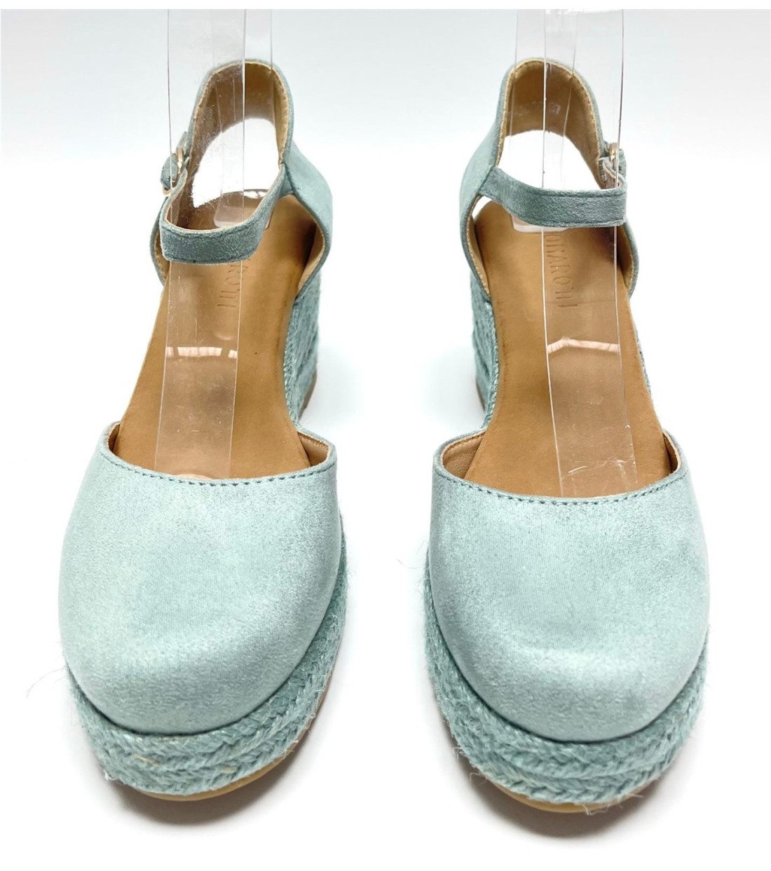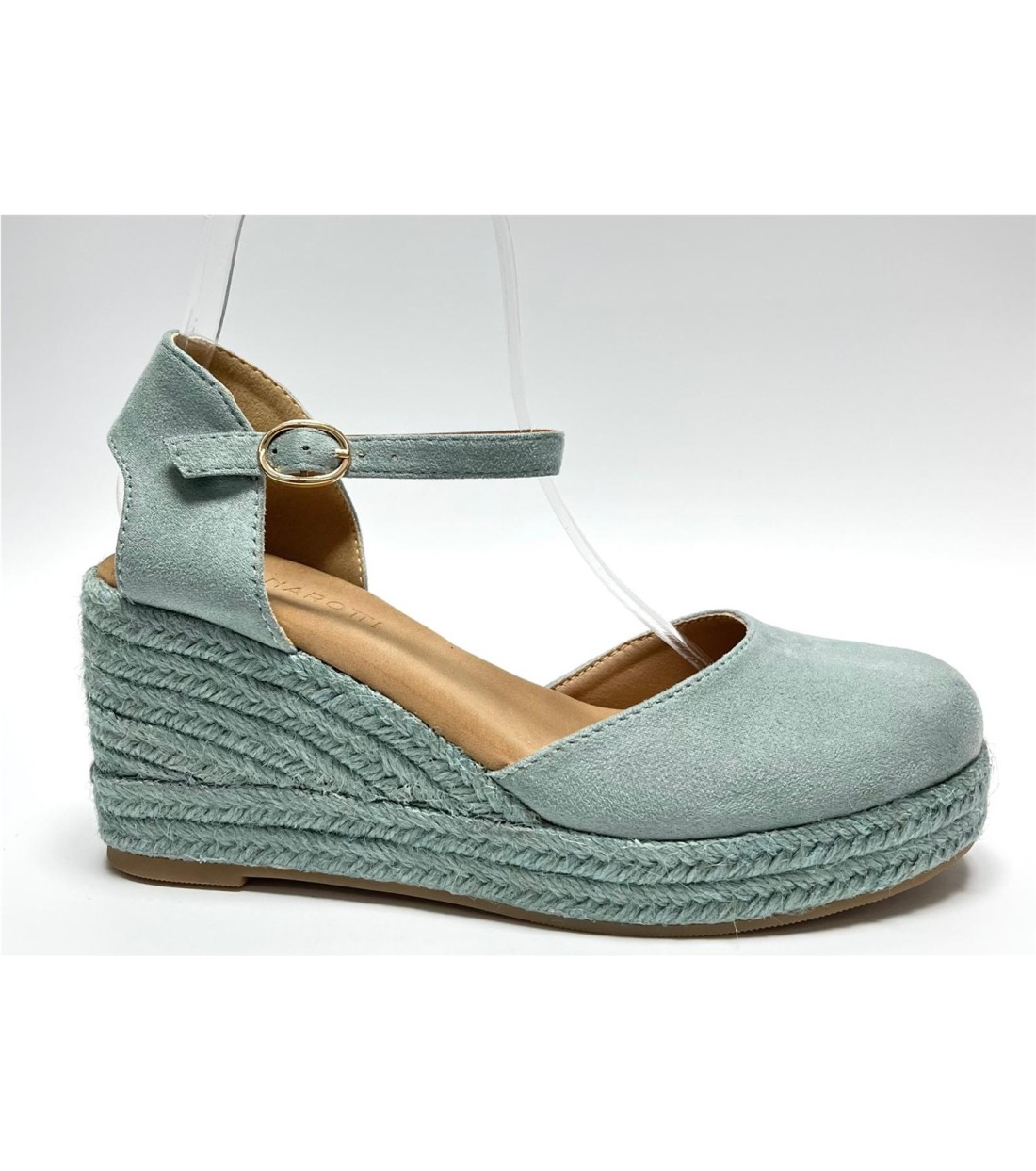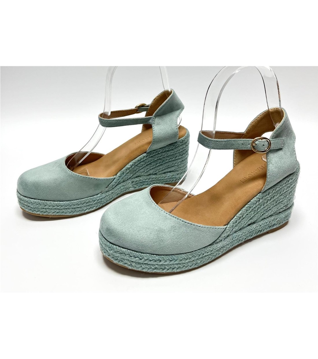 Cuña de mujer de esparto y antelina (blanco y dorado polipiel) con correa al tobillo. Cuña 8cm. Plataforma 2cm