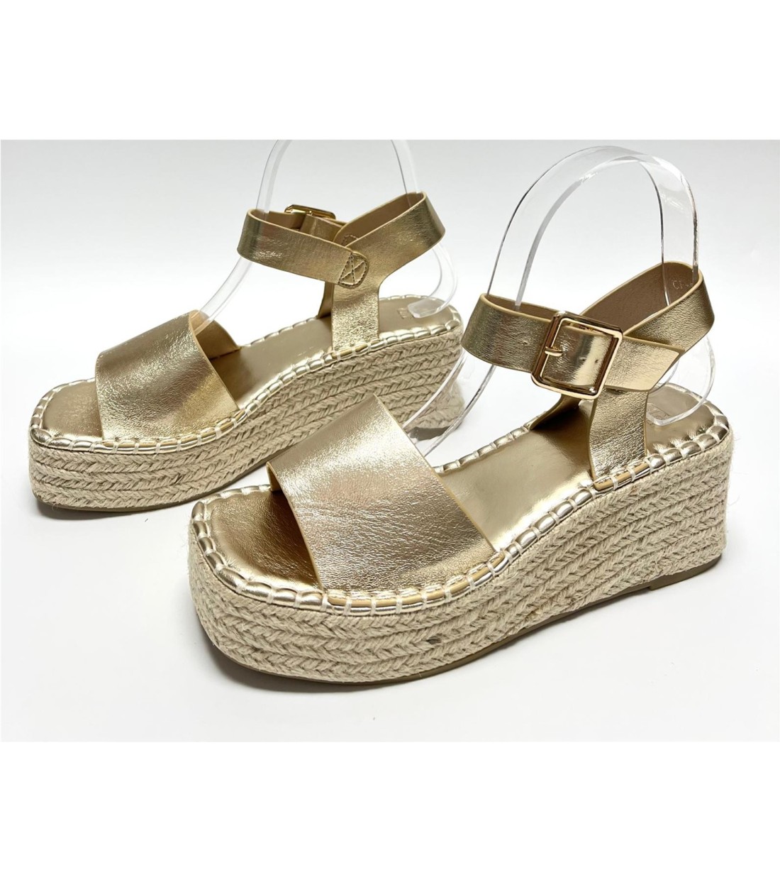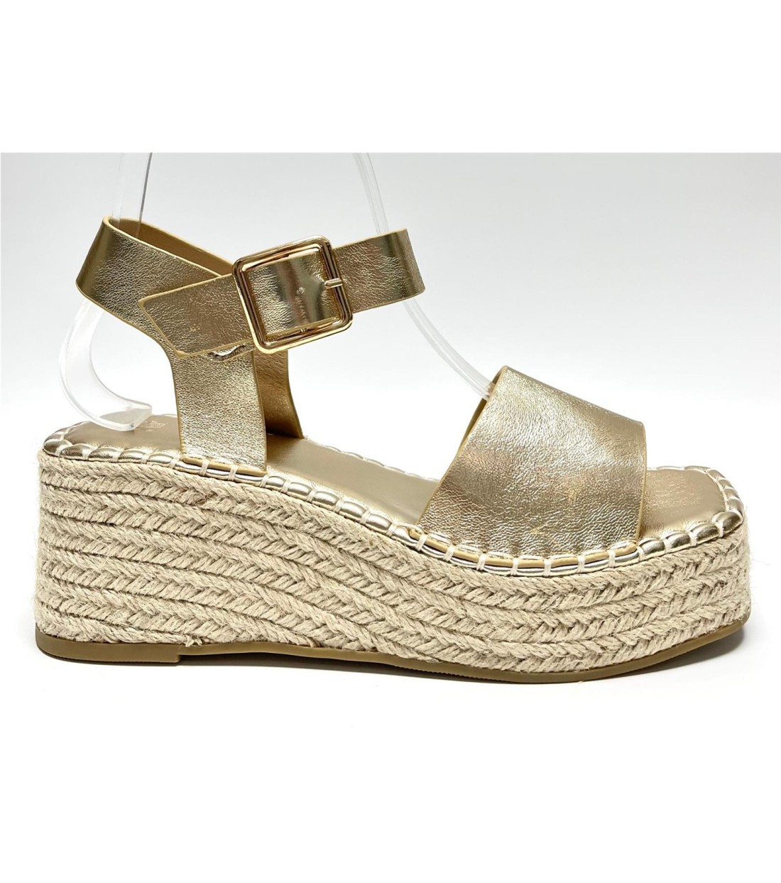 Cuña de mujer de antelina y esparto (dorada de polipiel) con correa a tobillo. Cuña 6,5cm. Plataforma 3cm