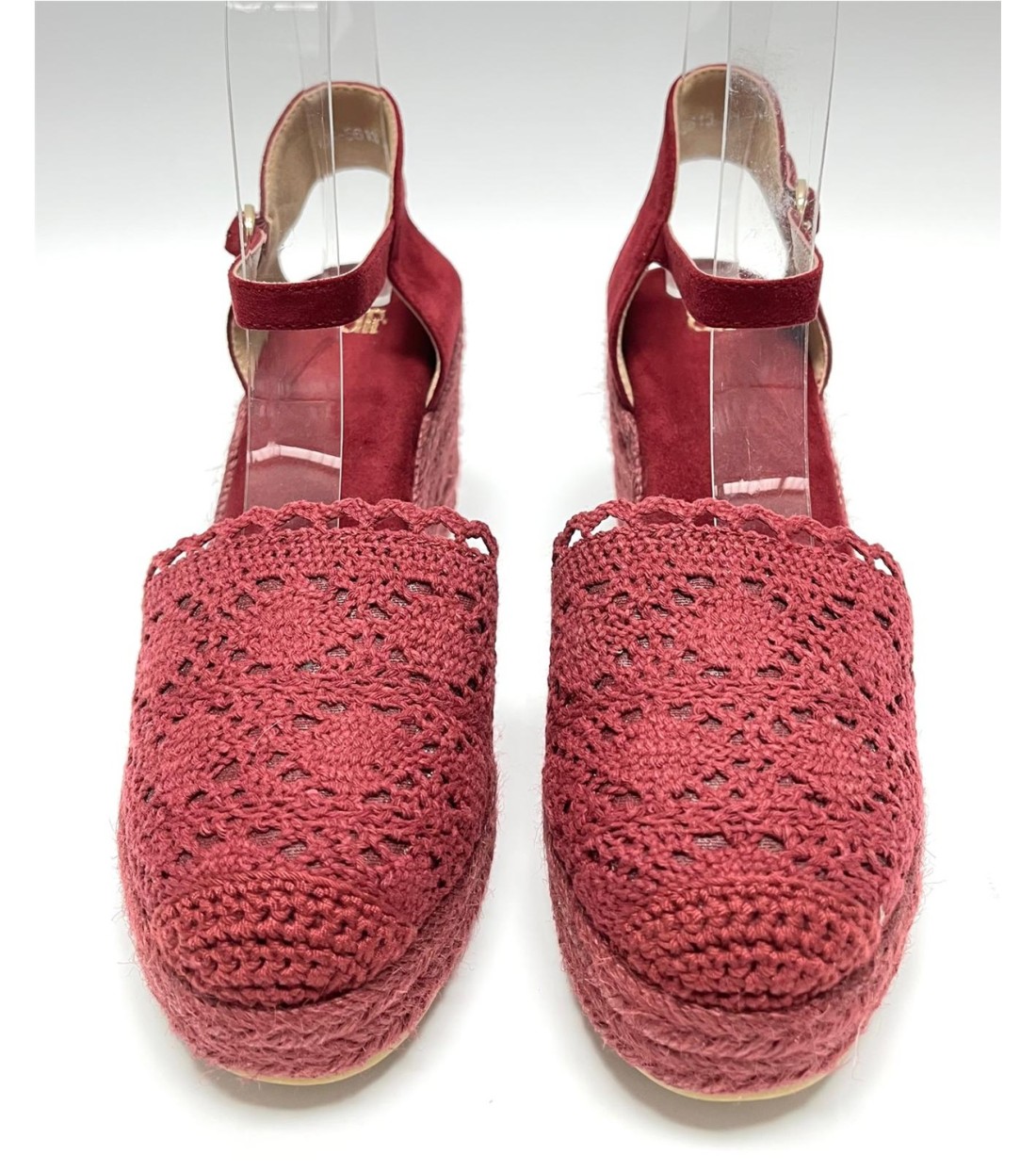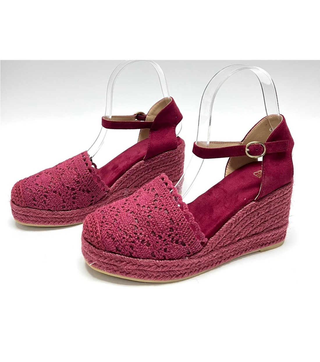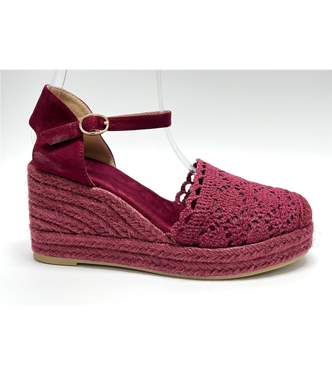 Cuña de mujer de esparto tejido y croche, correa a tobillo. Cuña 8cm. Plataforma 2cm