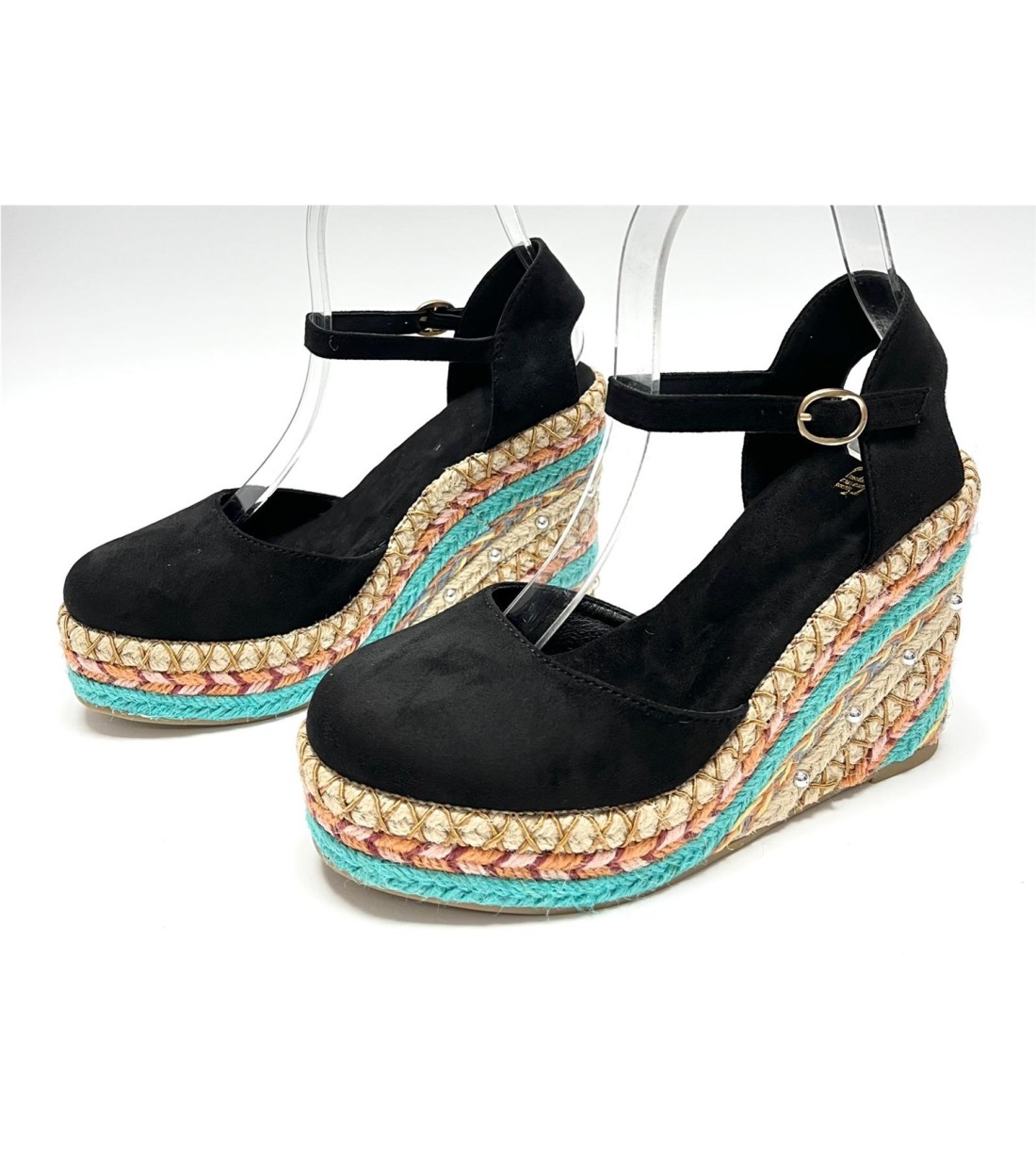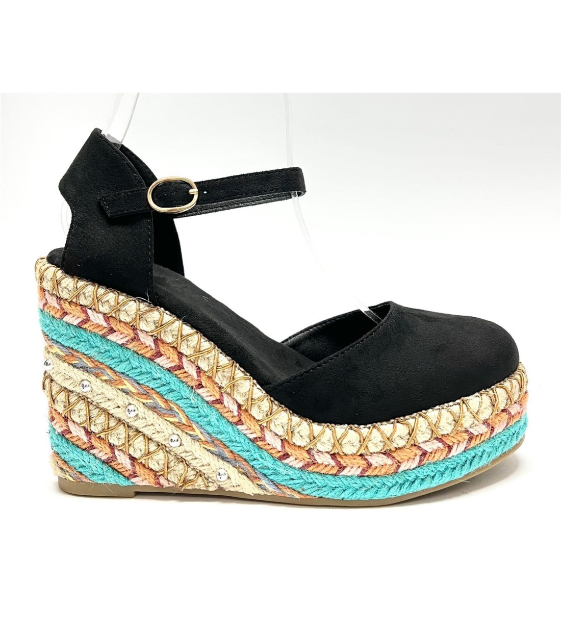 Cuña de mujer de esparto y antelina con correa a tobillo. Cuña 11cm. plataforma 3cm