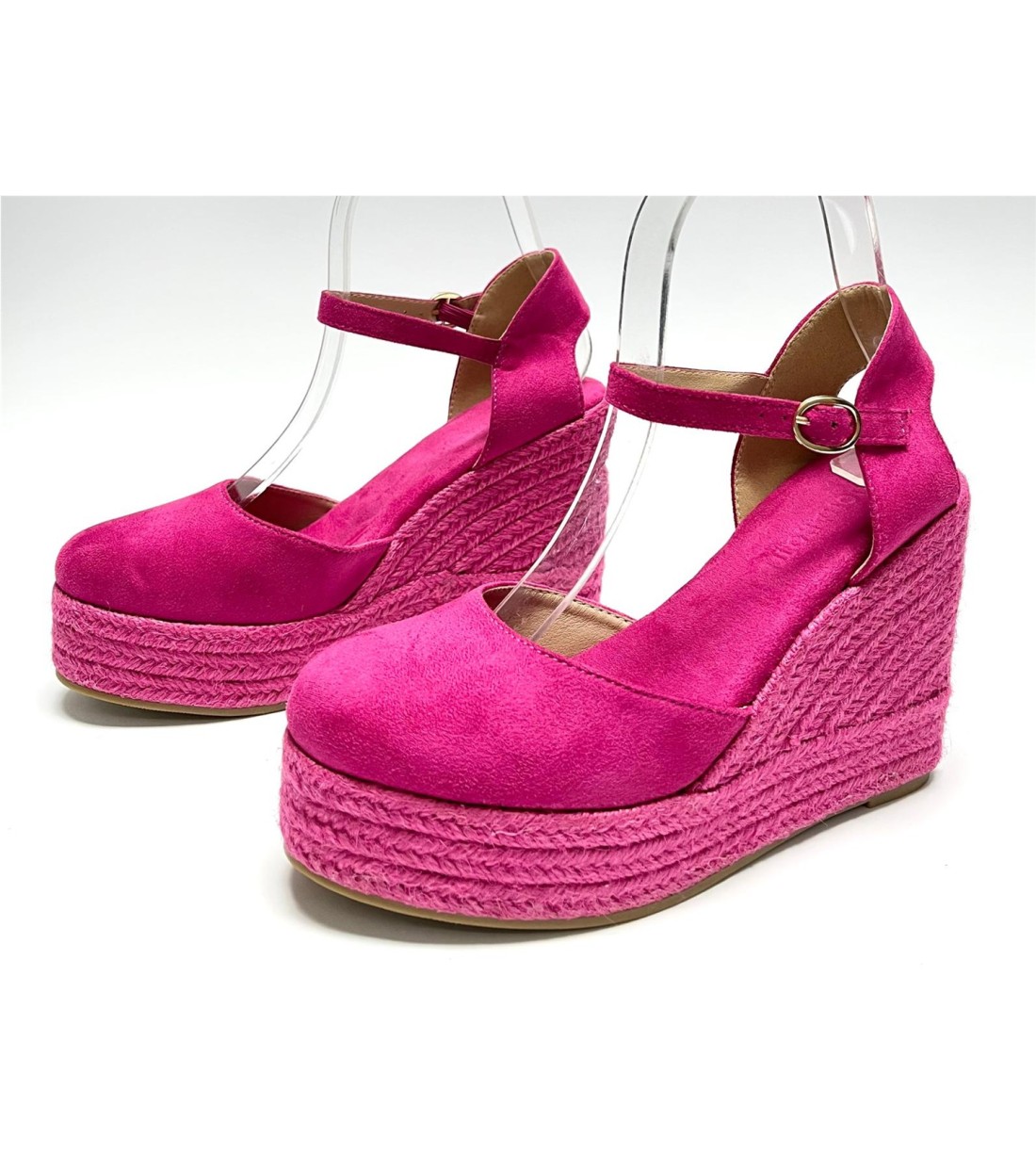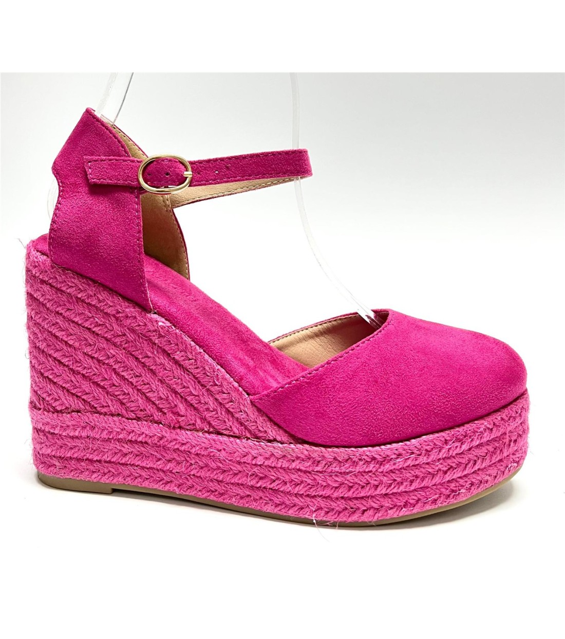 Cuña de mujer de esparto y antelina (dorada y blanca polipiel) con correa a tobillo. Cuña 11cm. plataforma 3cm