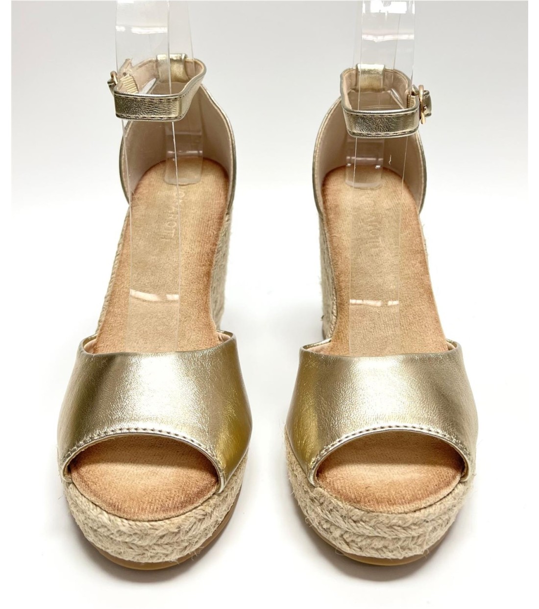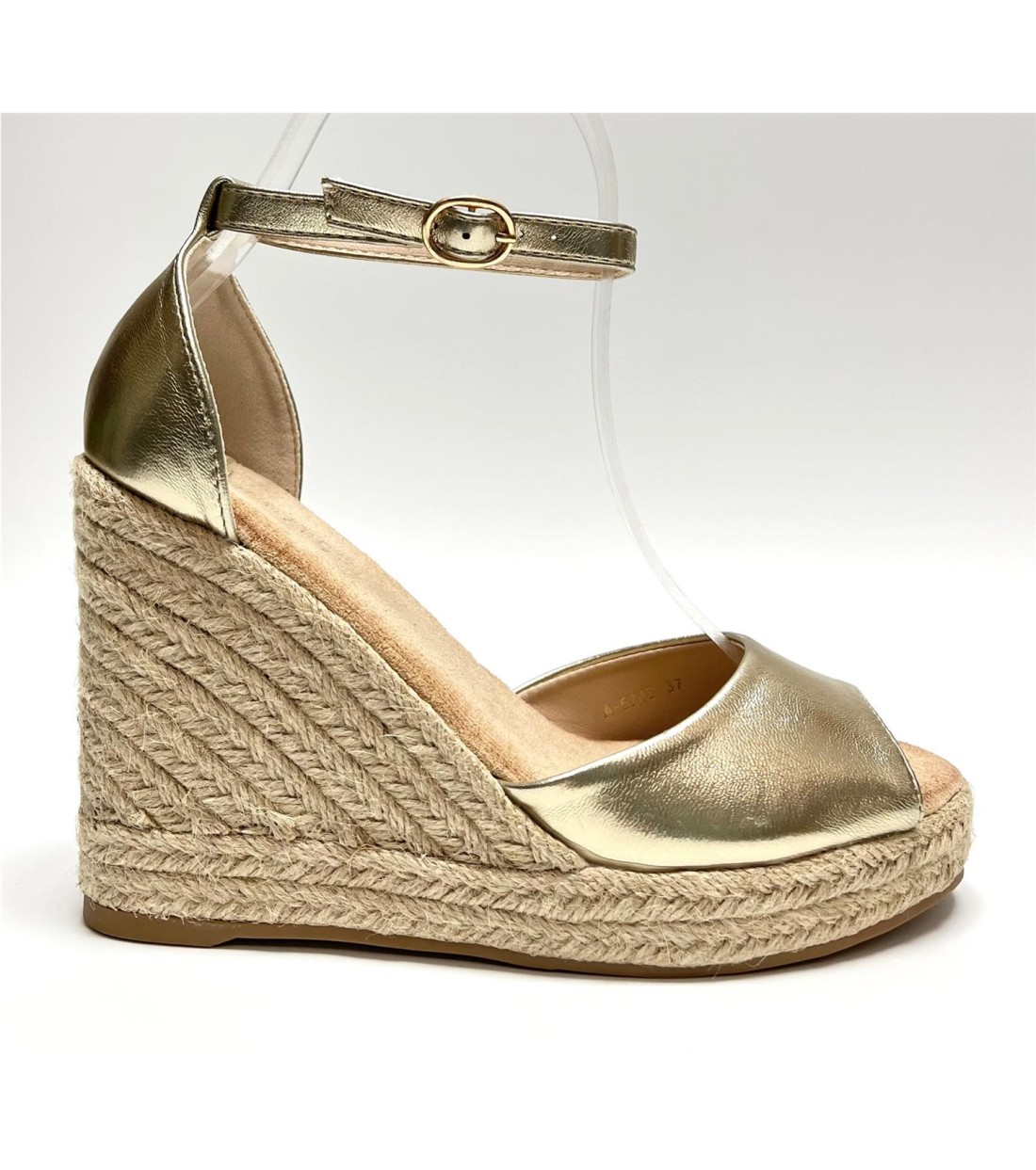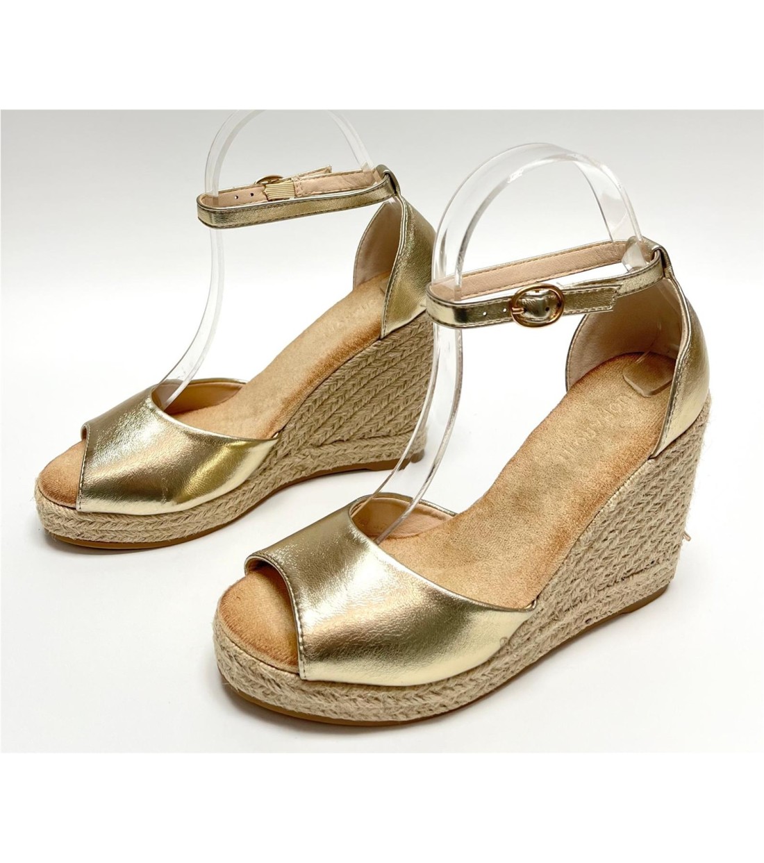 Sandalia de mujer de esparto y antelina (dorada y blanca polipiel). Cuña 10,5cm. Plataforma 2cm