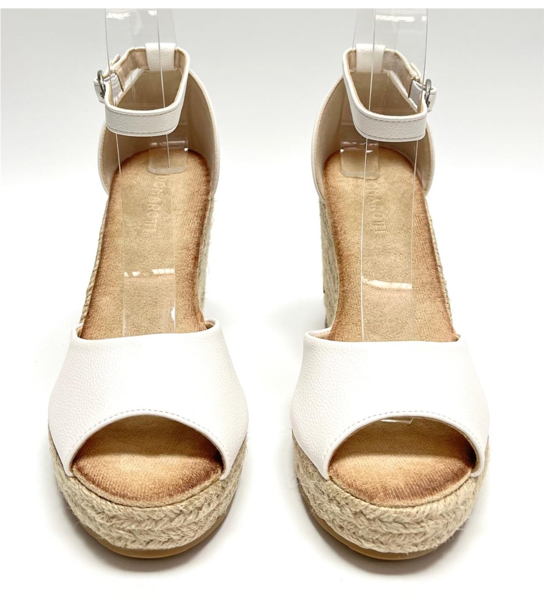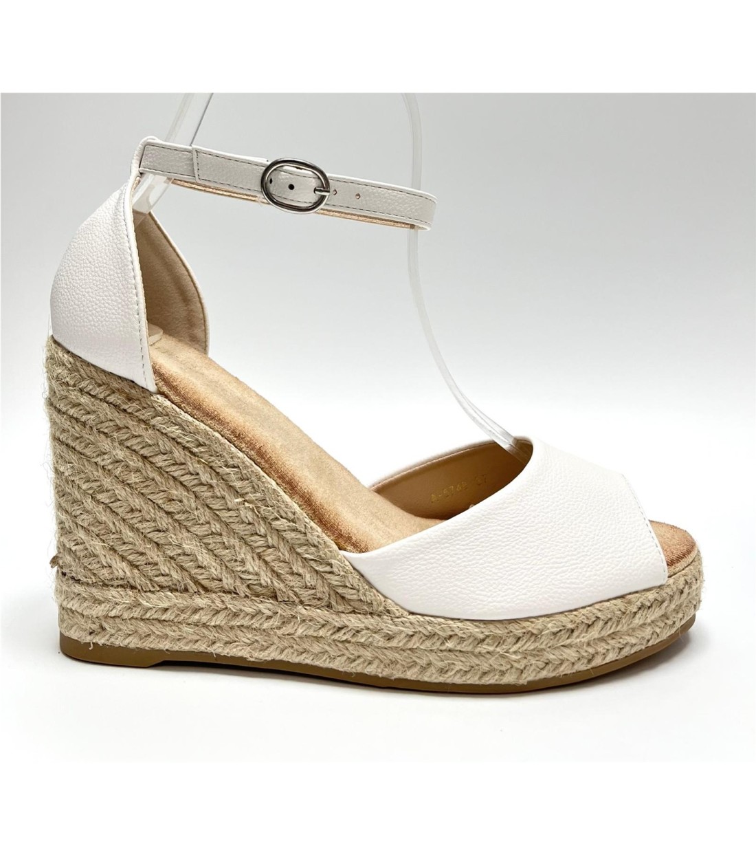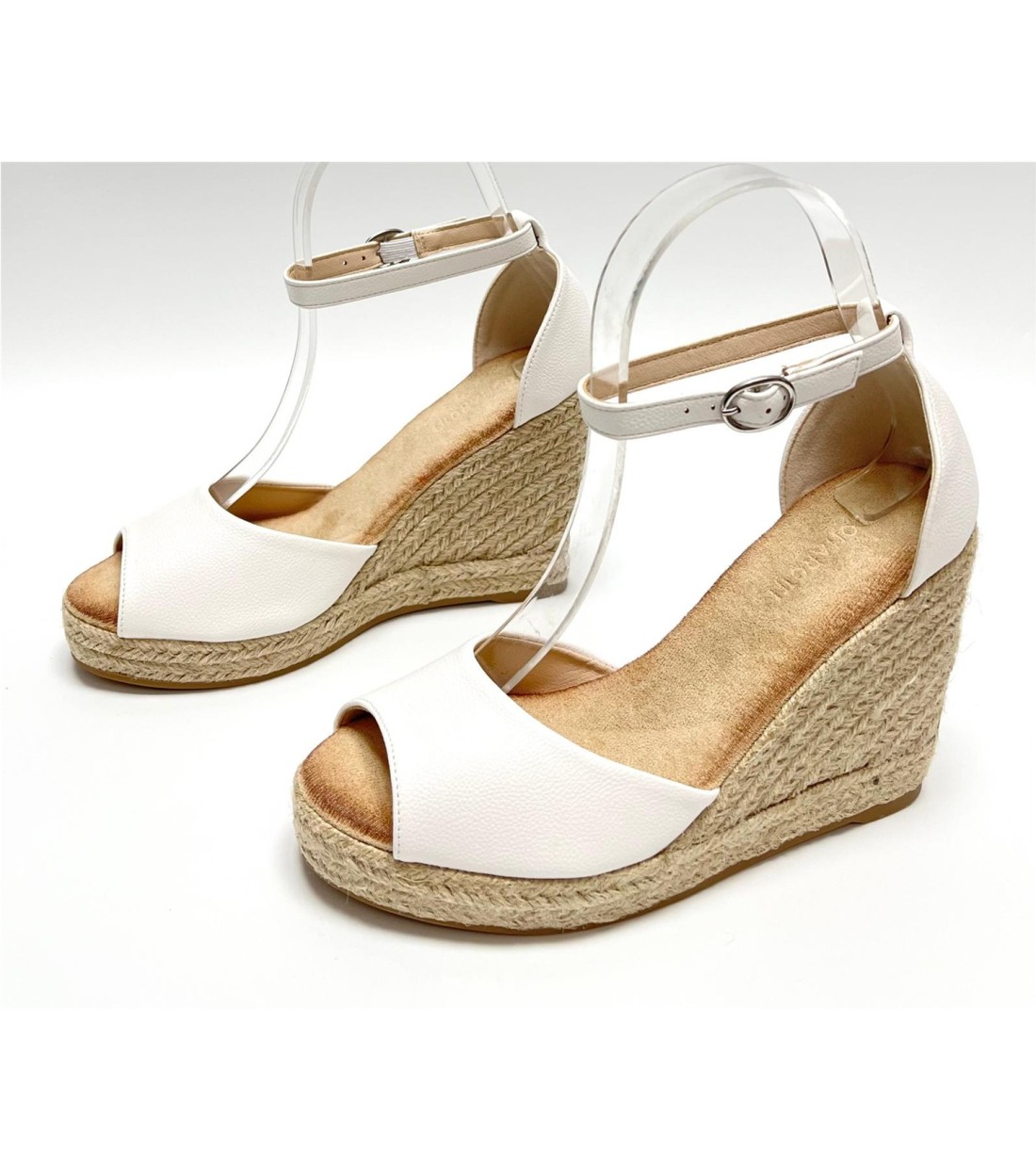 Sandalia de mujer de esparto y antelina (dorada y blanca polipiel). Cuña 10,5cm. Plataforma 2cm