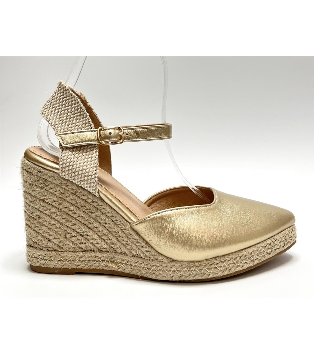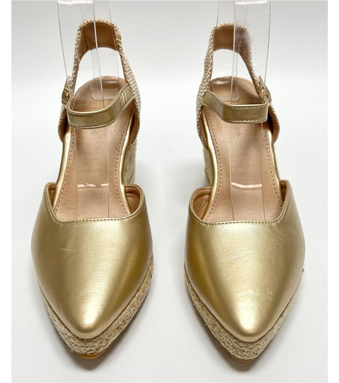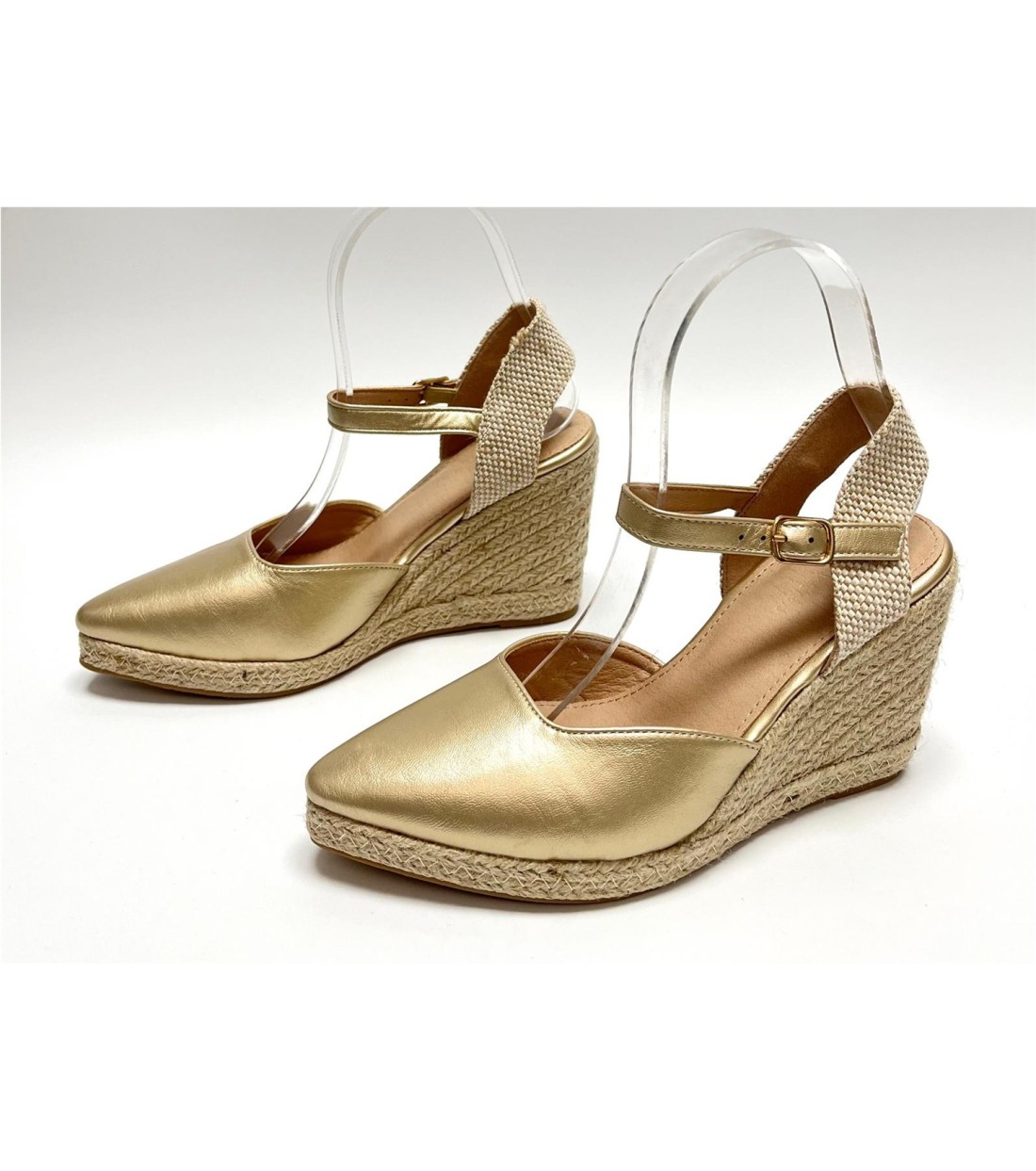 Cuña de mujer de esparto y antelina (dorada polipiel). Cuña 9,5cm. Plataforma 1,5cm