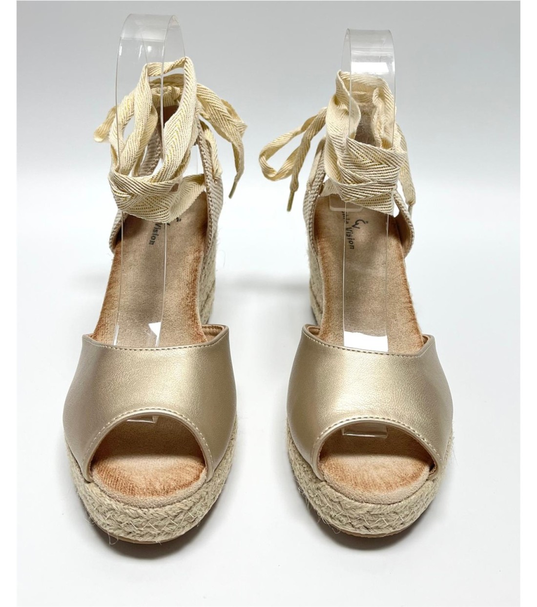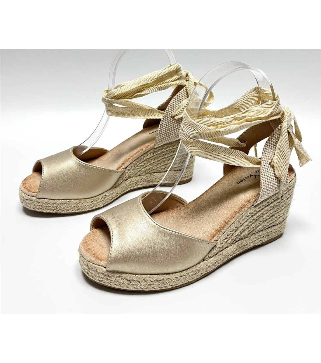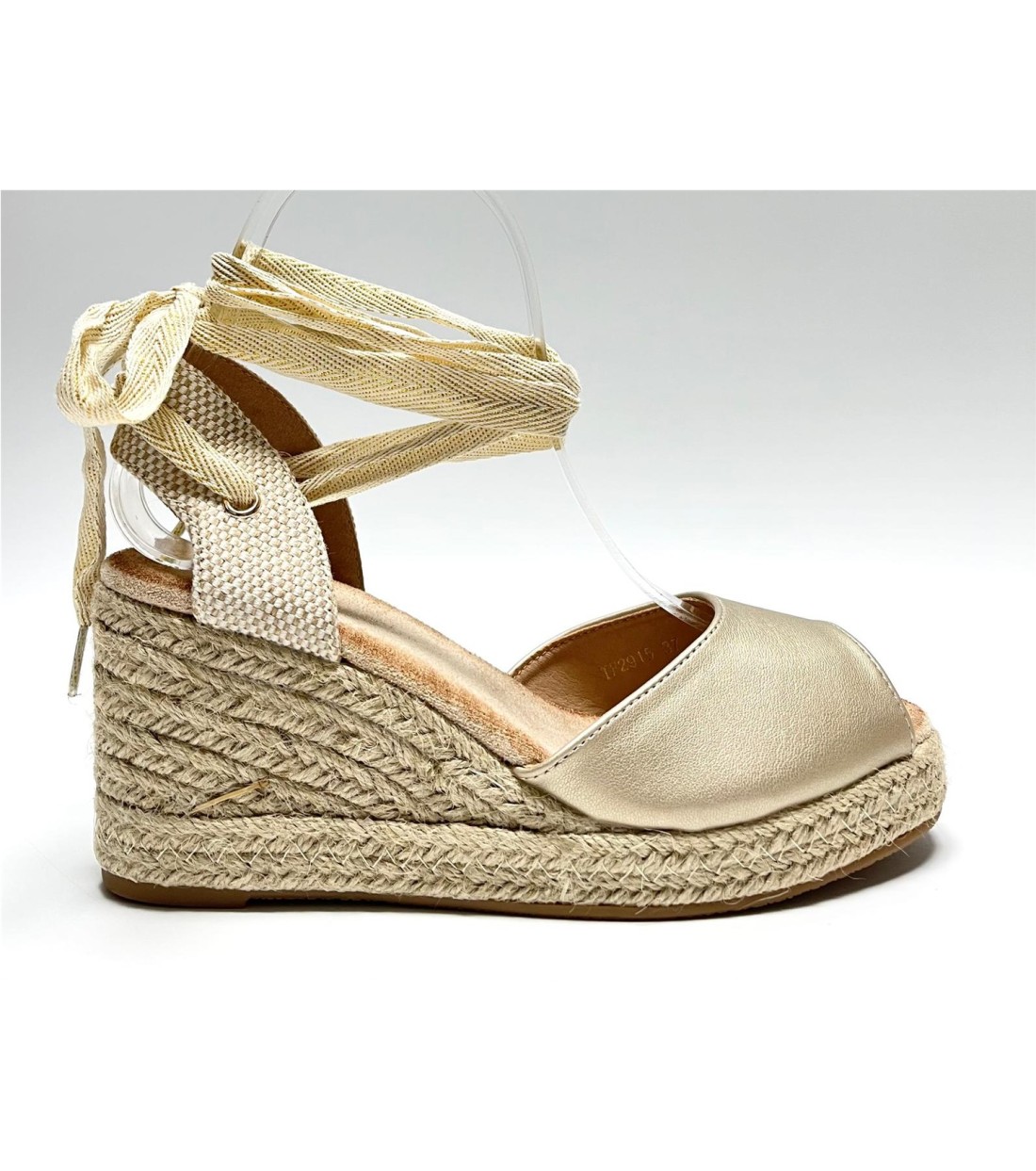 Sandalia de mujer de antelina (dorada polipiel) con cuerda al tobillo. Cuña 7,5cm. Plataforma 2cm