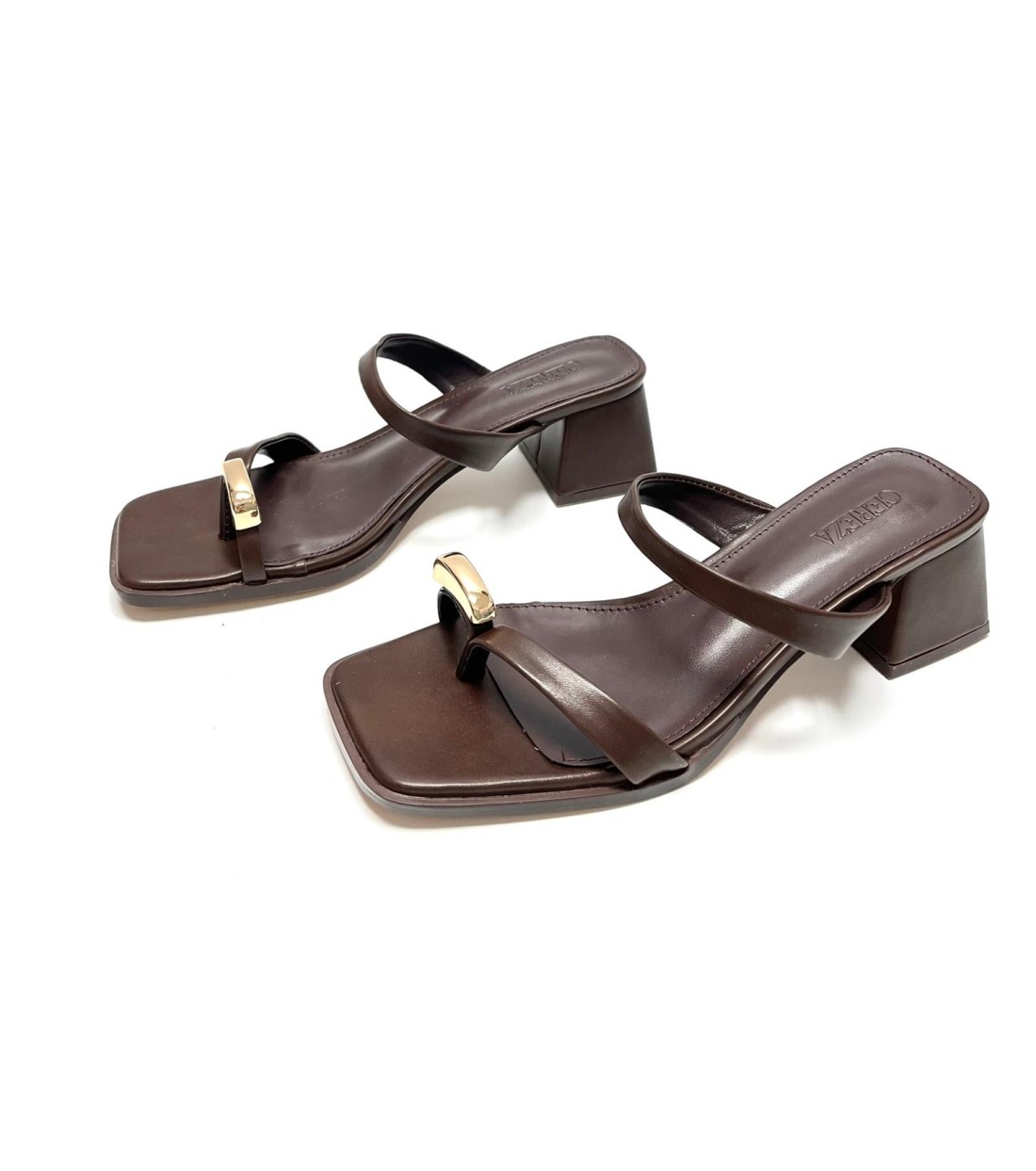 Sandalia de mujer de polipiel de tiras y metida por el dedo con adorno dorado. Tacon 5cm