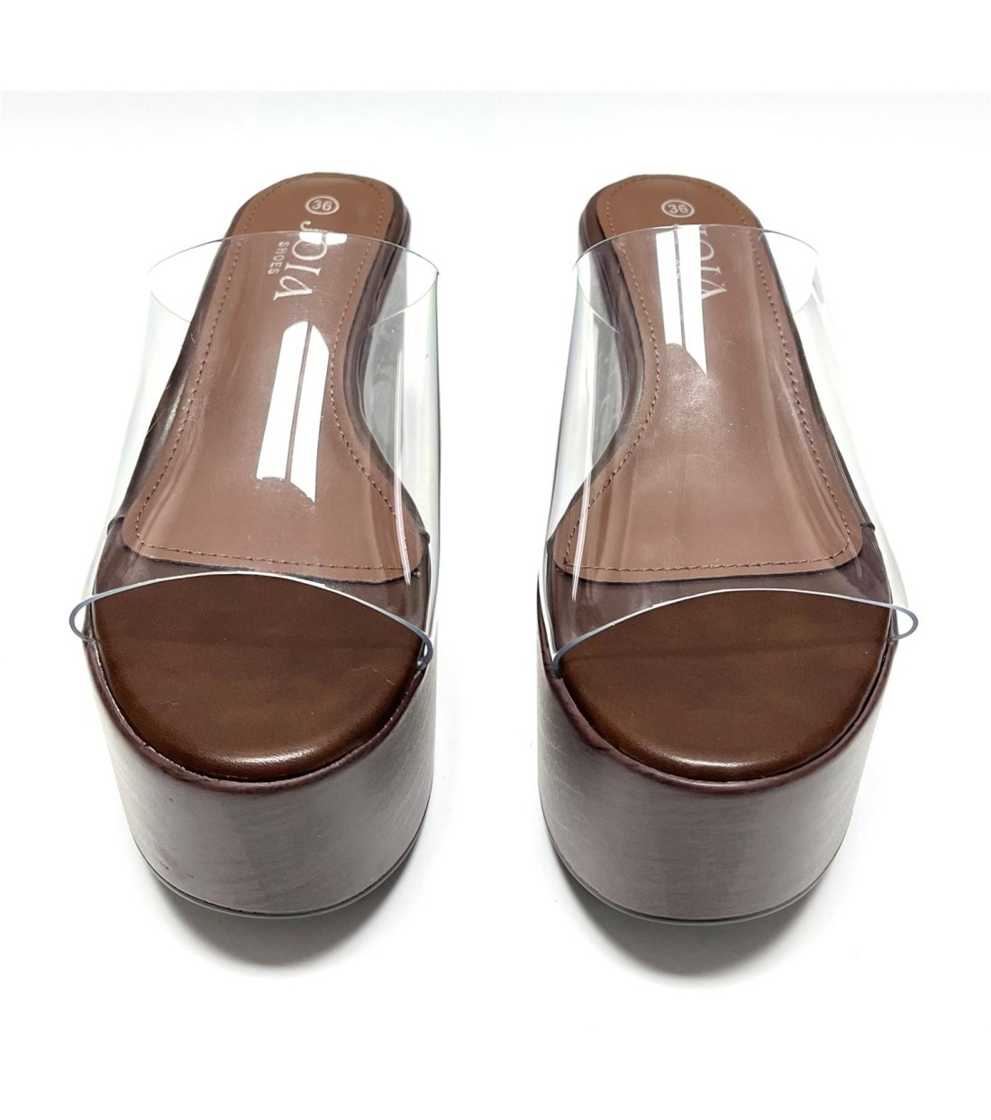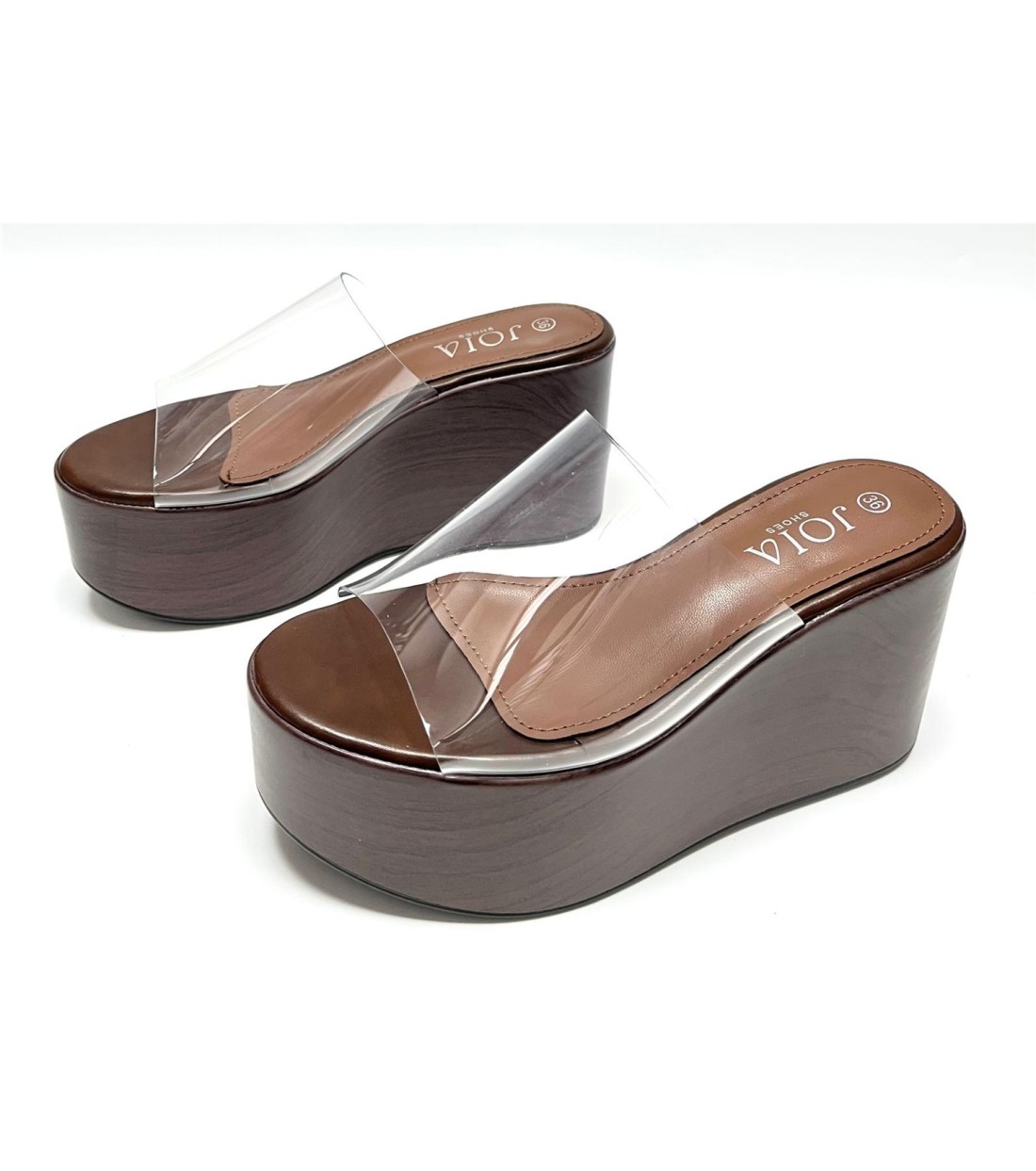 Zueco de mujer de polipiel (transparente vinilo). Cuña 9cm. Plataforma 6cm