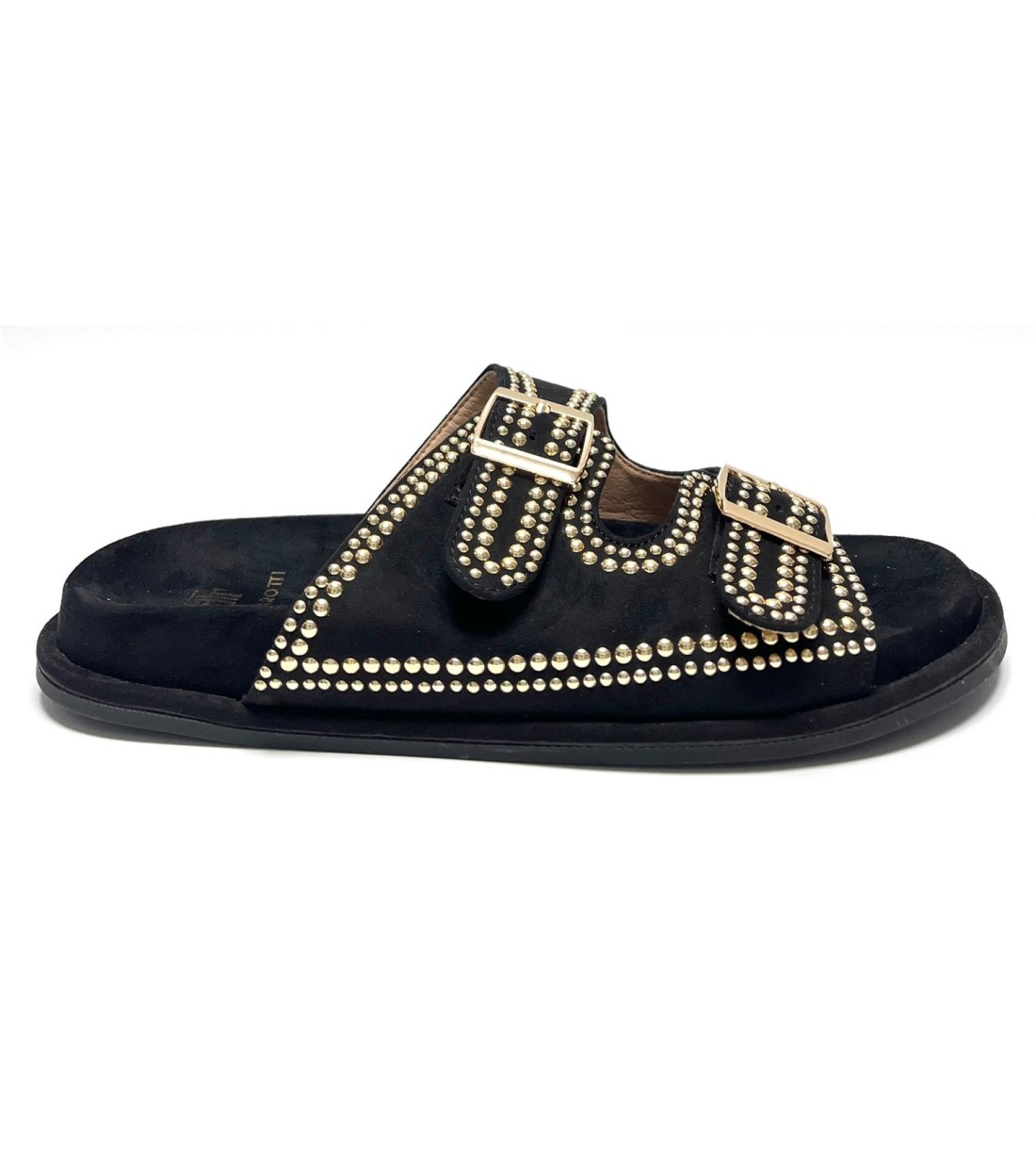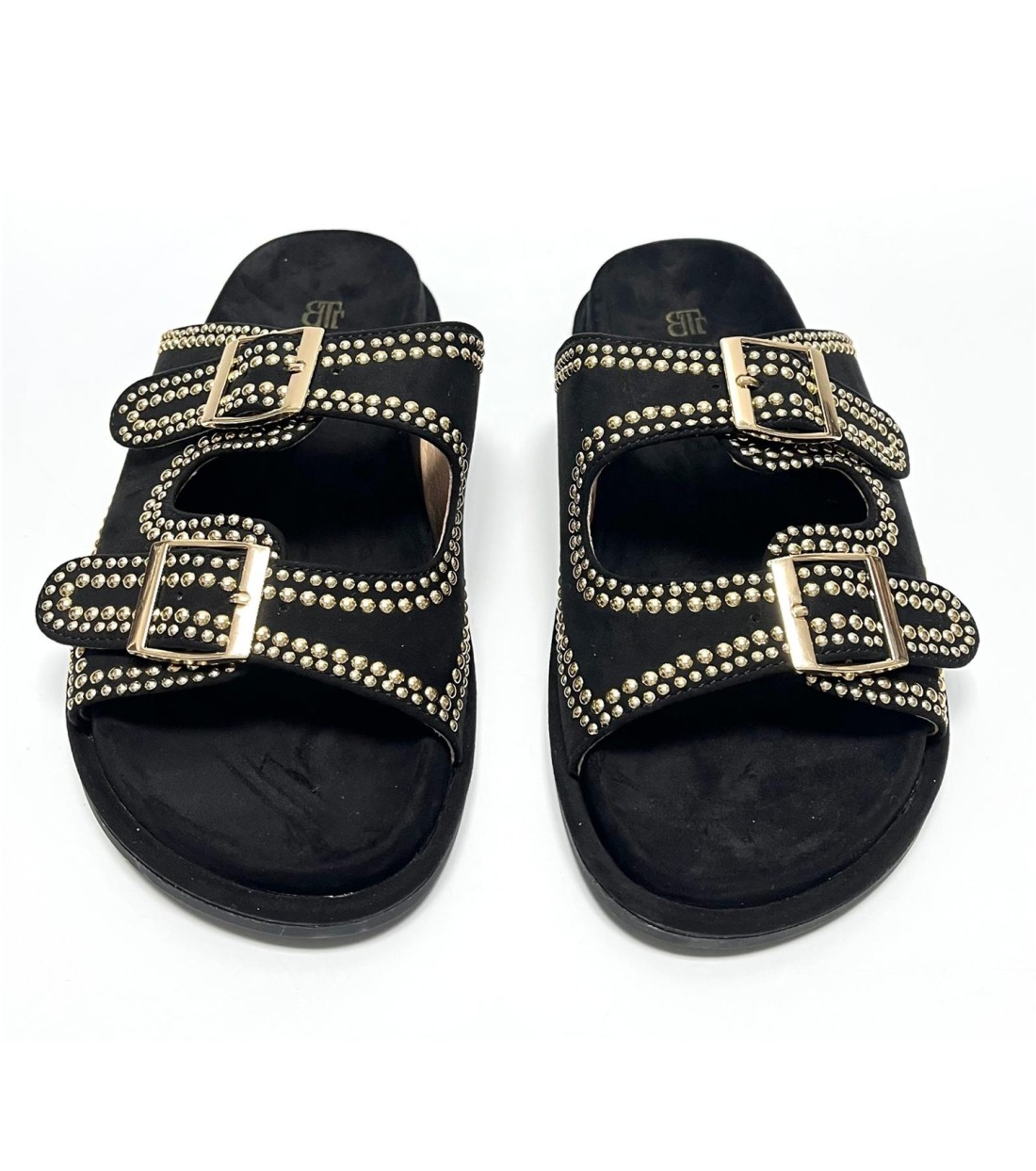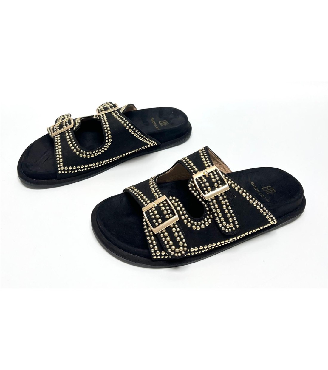 Sandalia de mujer tipo bio de antelina con remaches dorados. Altura 2cm