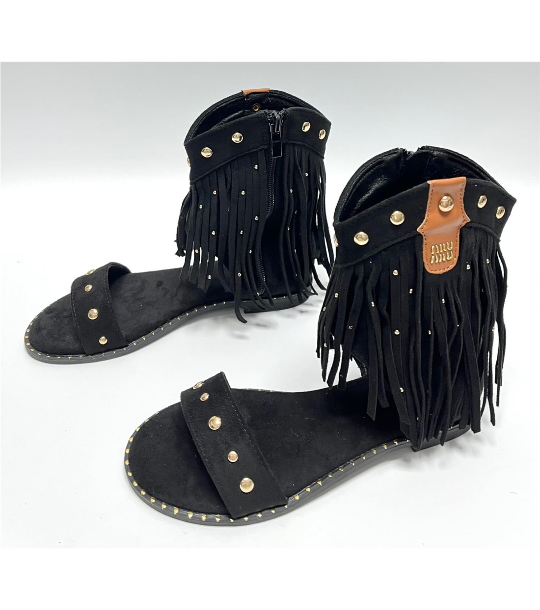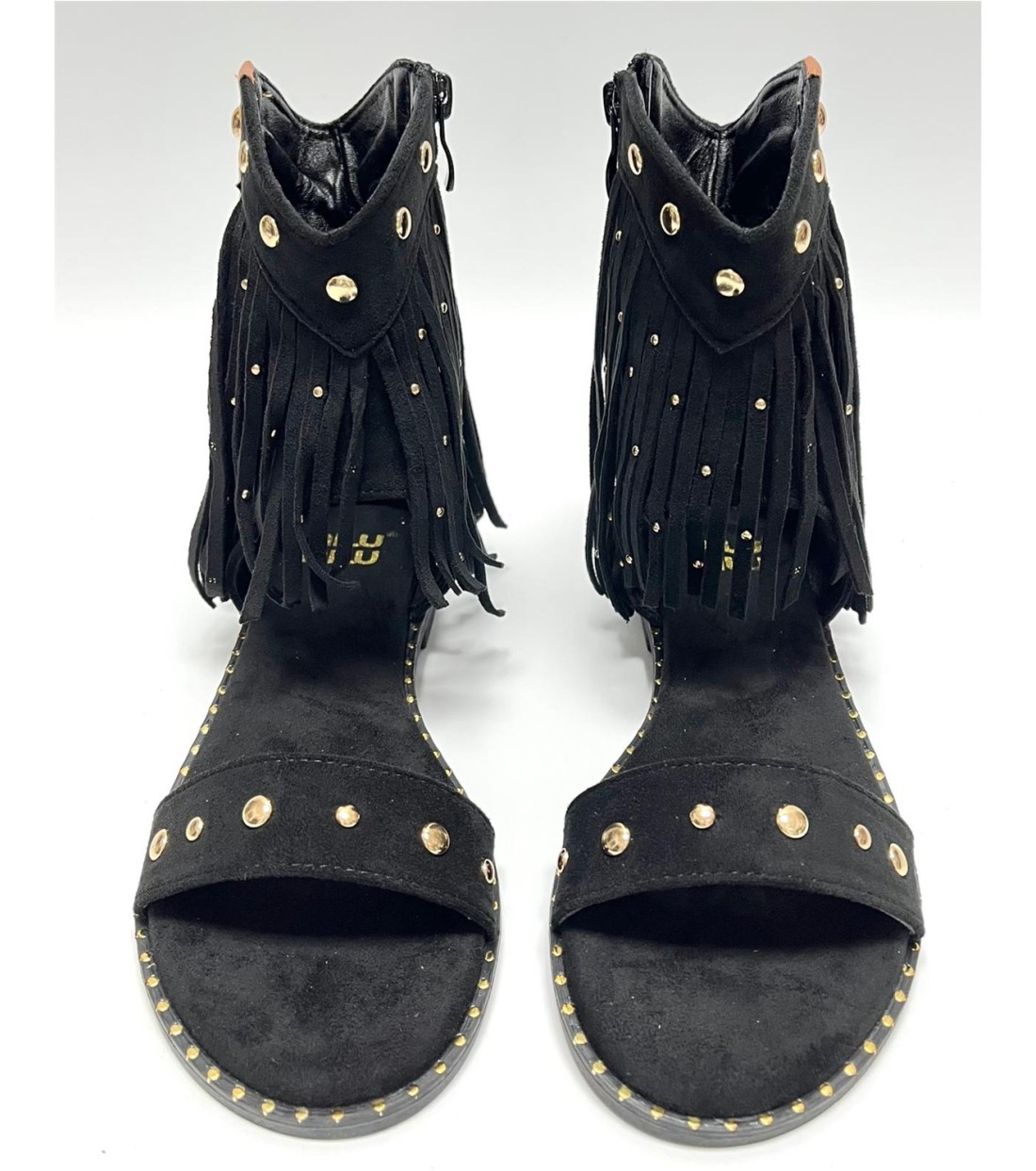 Sandalia de mujer atobillada con cremallera lateral de antelina con flecos y remaches dorados