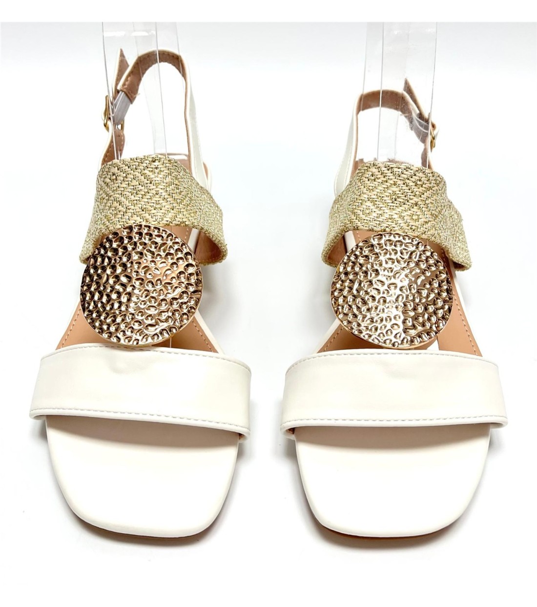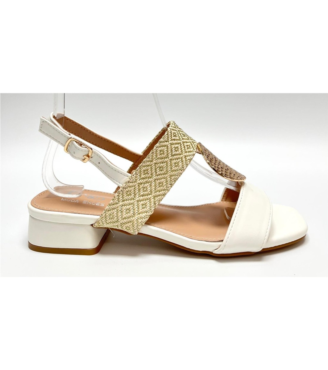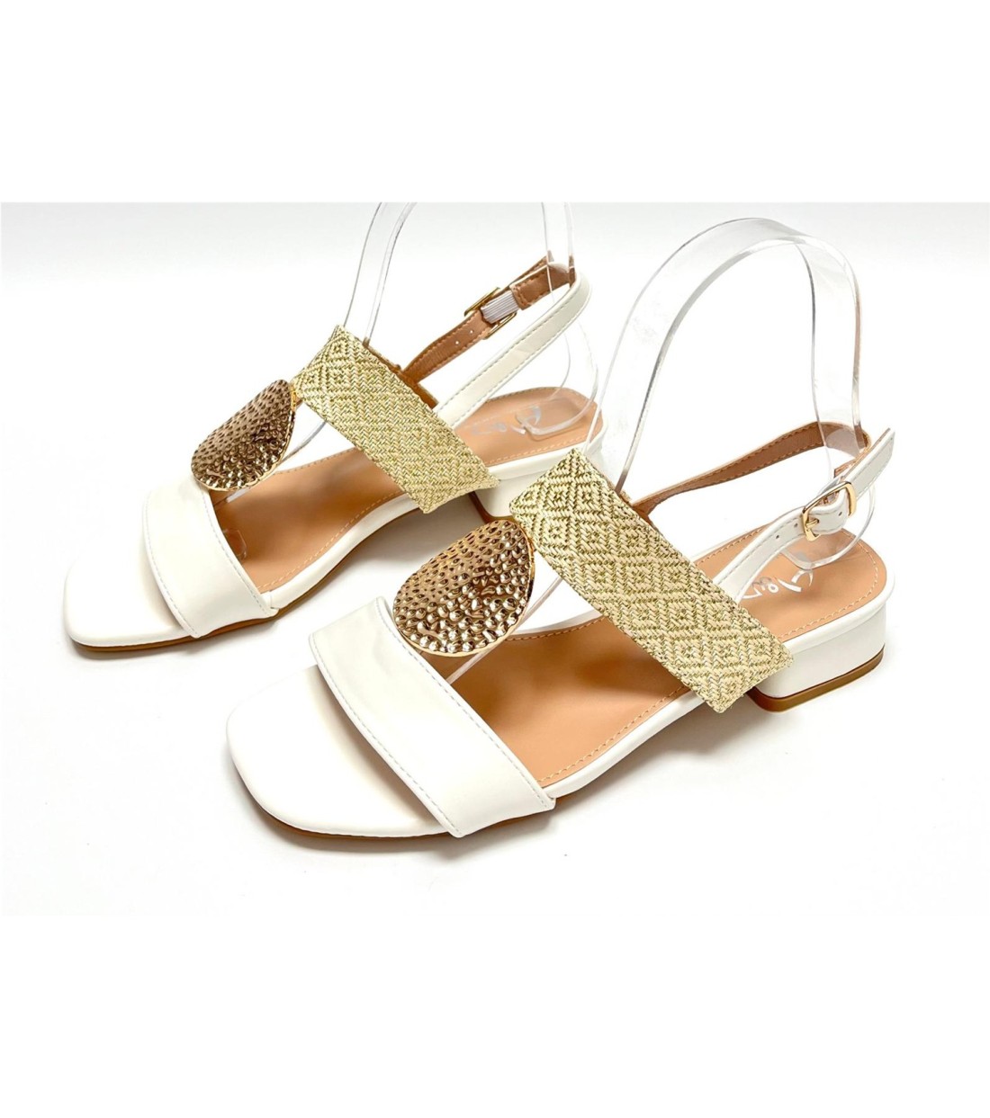 Sandalia de mujer de antelina y tejido (blanca y dorada polipiel). Tacon 3,5cm