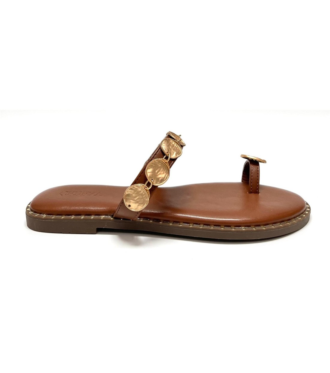 Sandalia de mujer de polipiel con adornos dorados. Planta acolchada