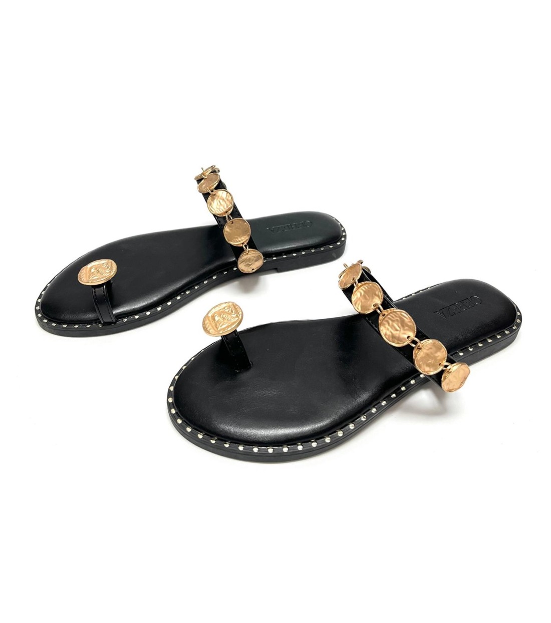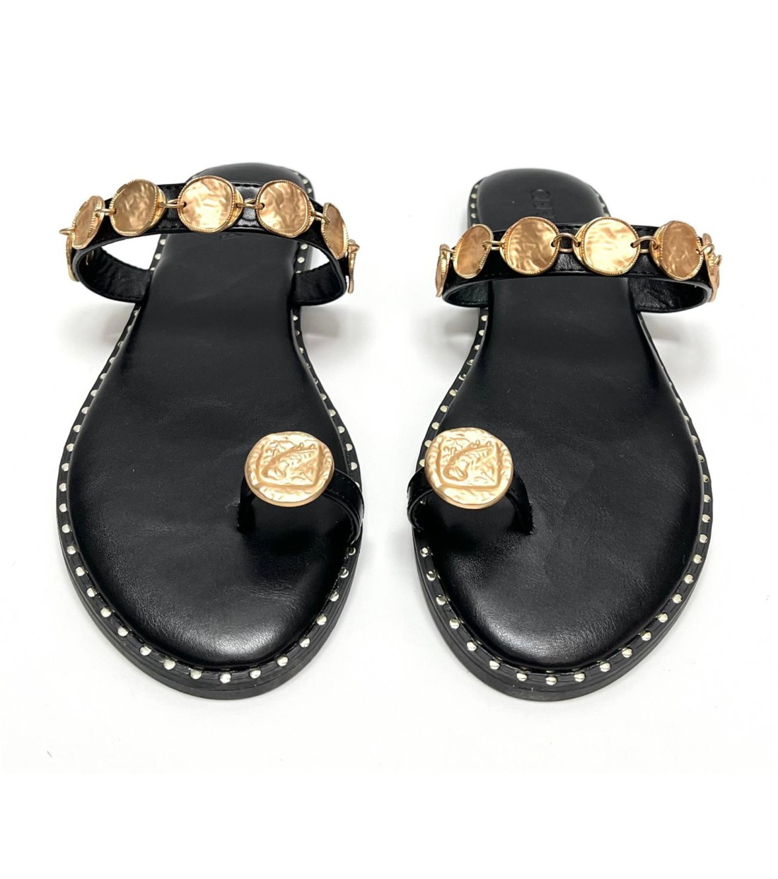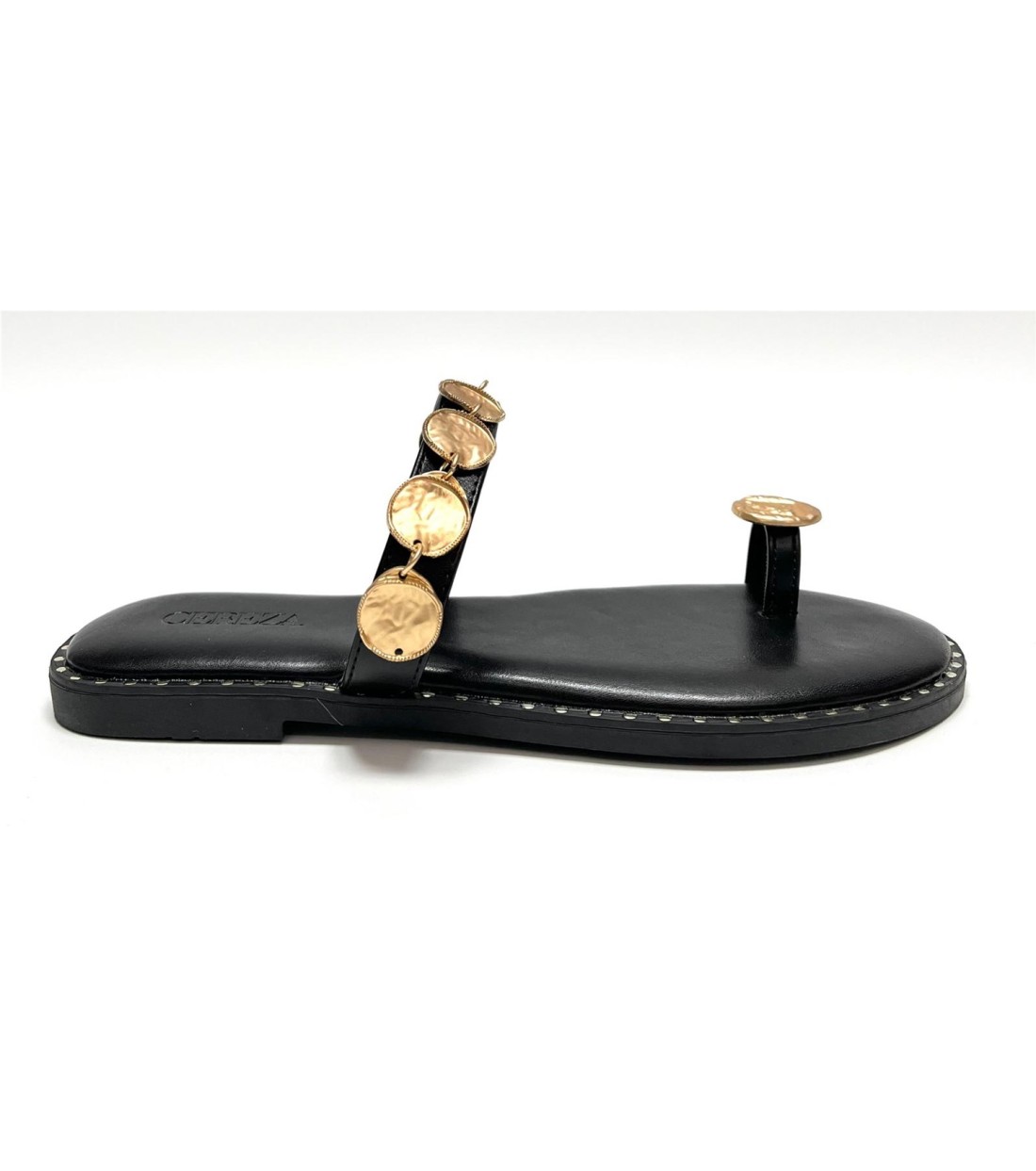 Sandalia de mujer de polipiel con adornos dorados. Planta acolchada