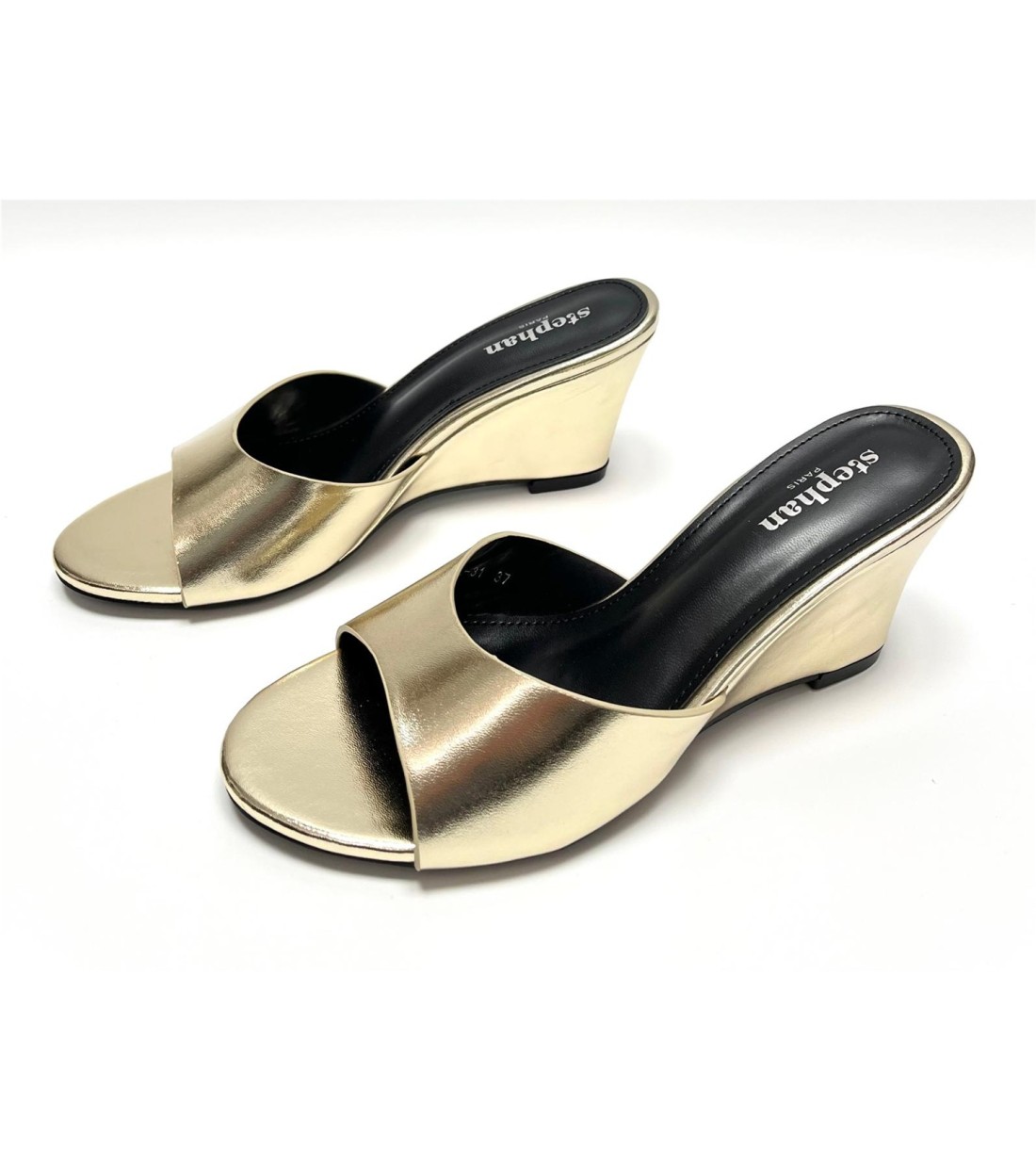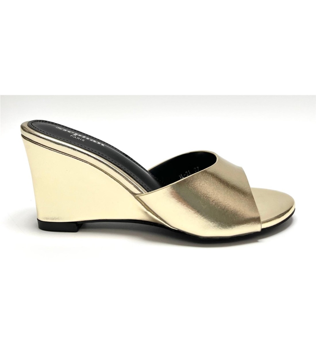 Sandalia de mujer de tipo charol (dorada polipiel). Cuña 8cm
