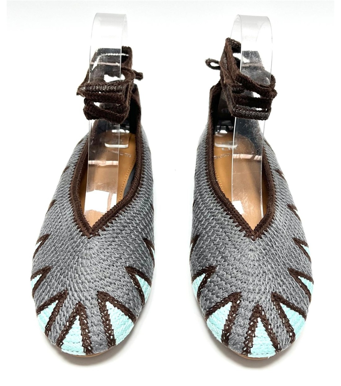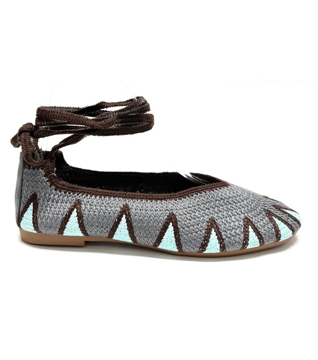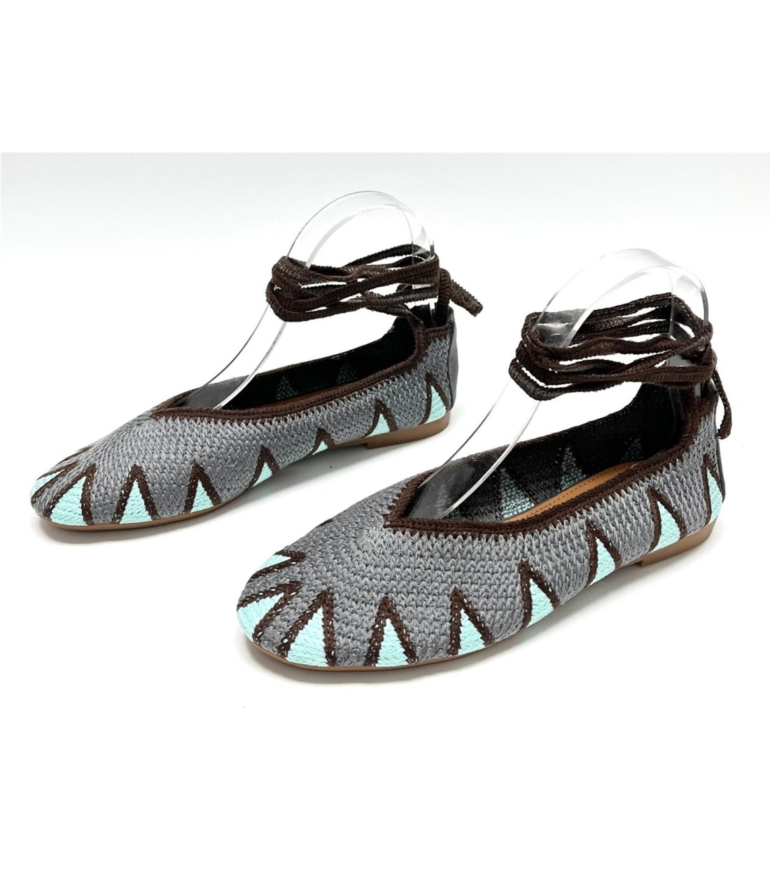Manoletina de mujer de croche con cuerda al tobillo. Planta acolchada