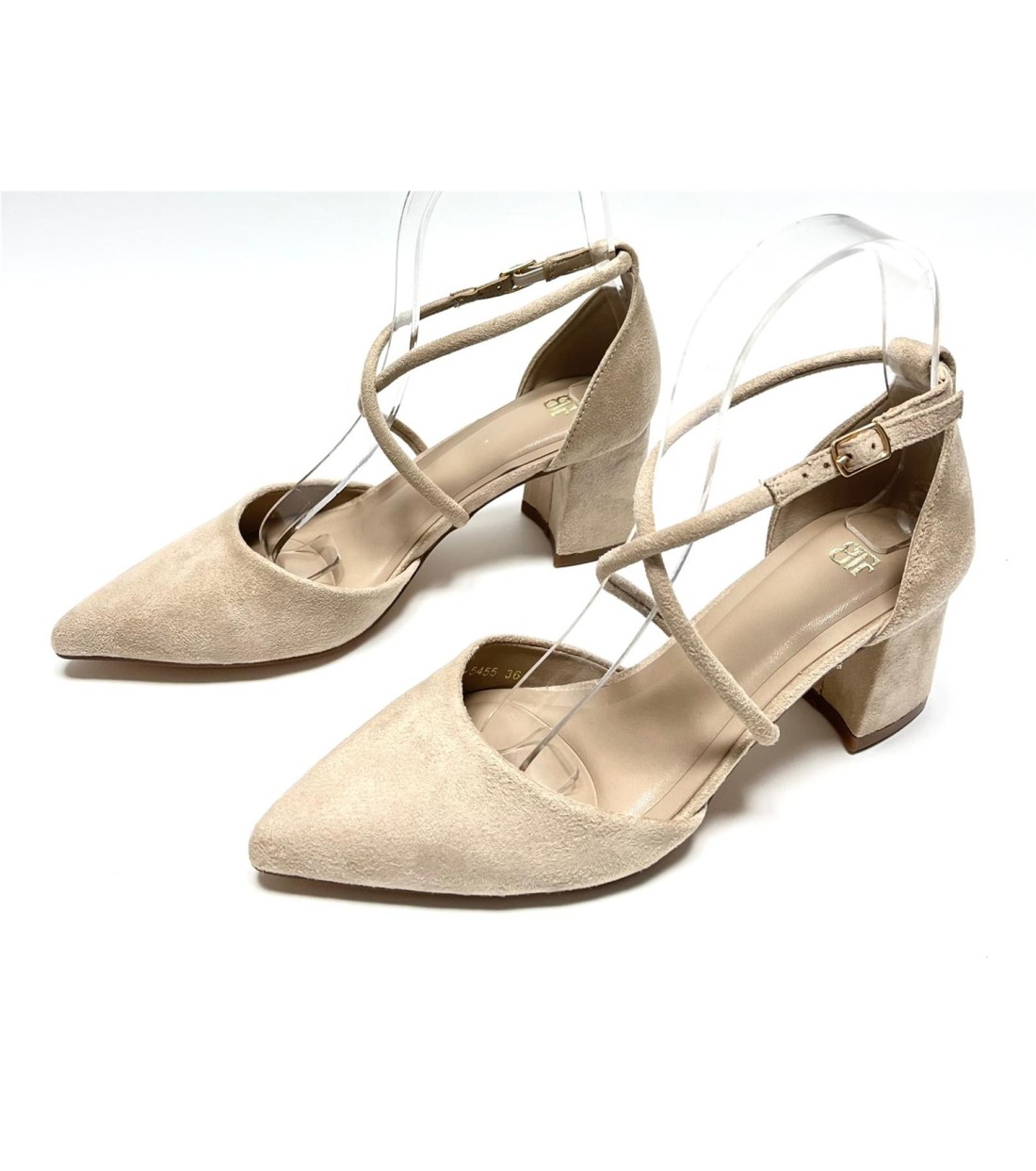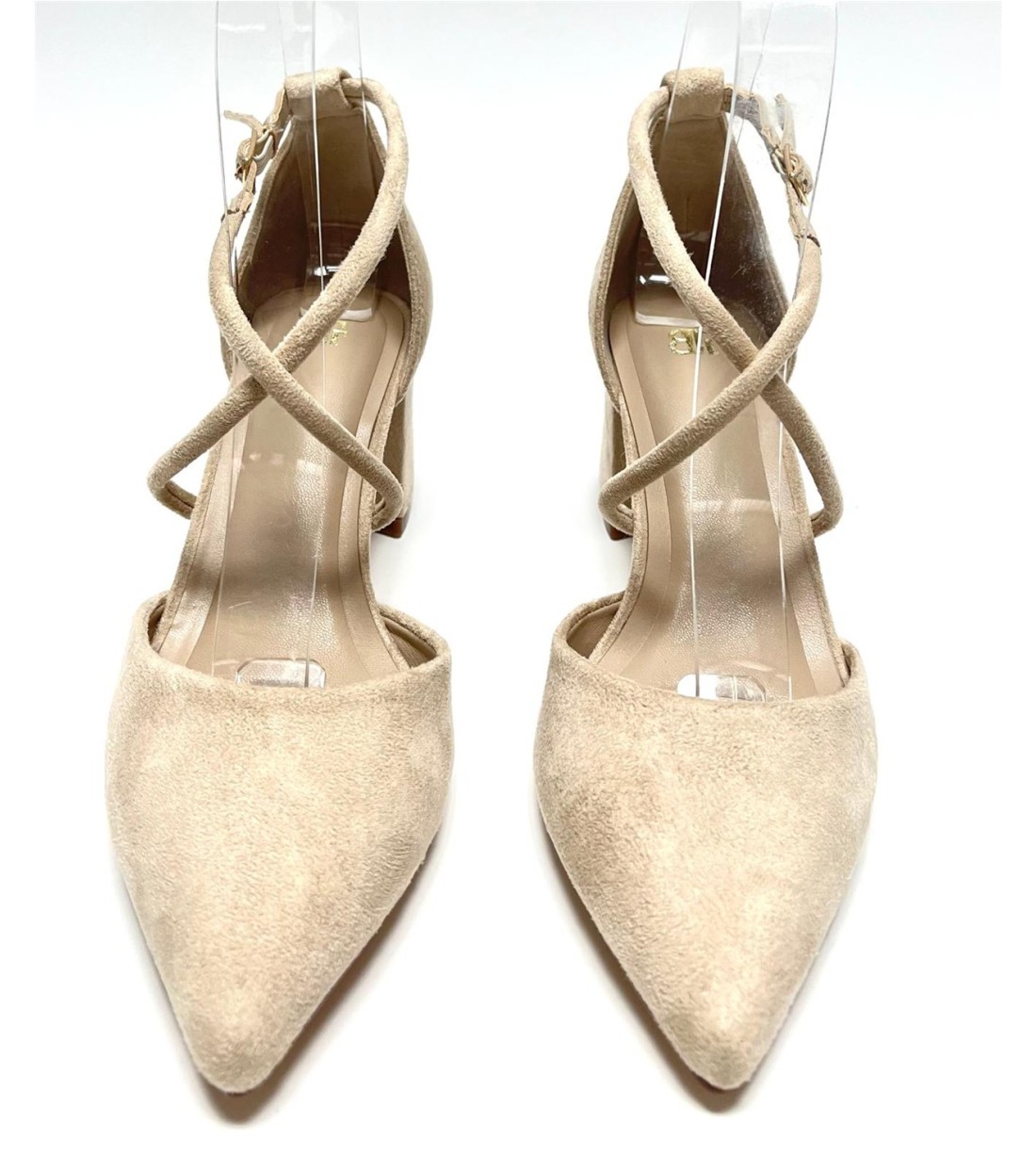 Zapato de salon de mujer de saten (beige antelina) con correa cruzada. Tacon 6cm