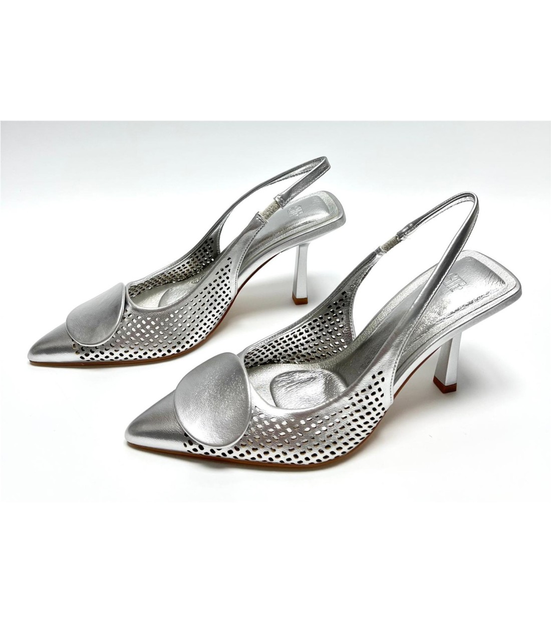 Zapato de salon de mujer de antelina(dorado y plata polipiel) calado. Tacon 9cm