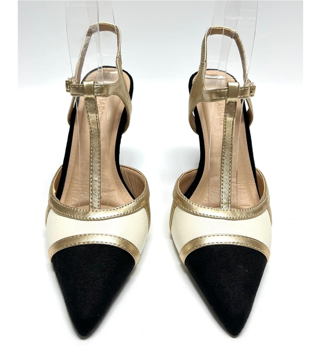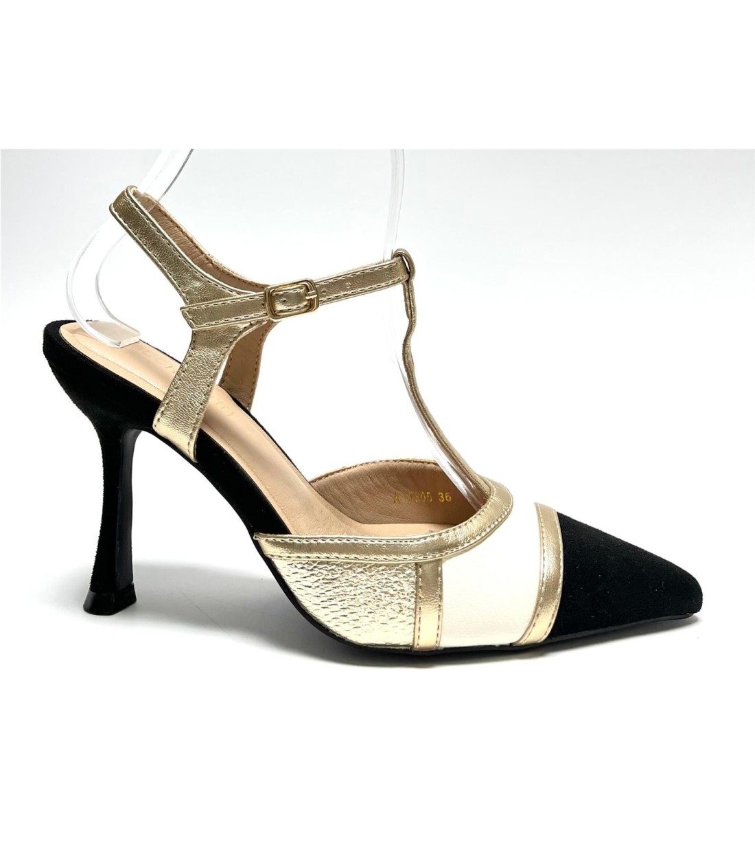 Zapato de salon de mujer de antelina y polipiel con correa a tobillo. Tacon 10cm